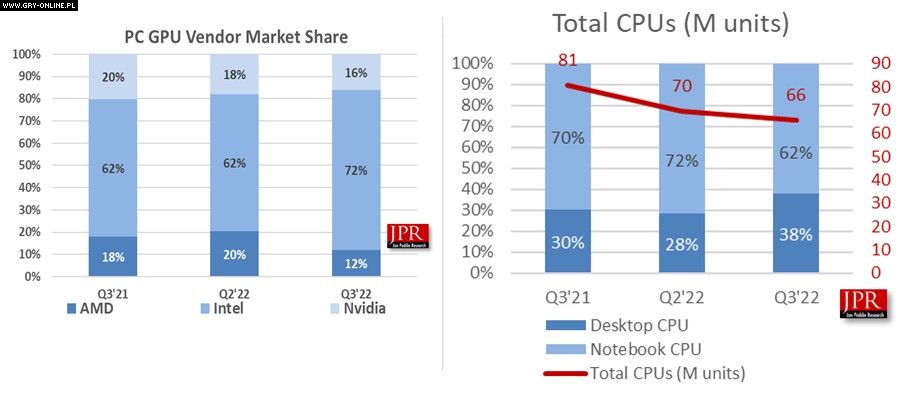 Firma badająca rynek tech Jon Peddie Research opublikowała raport dotyczący komputerowych układów graficznych. Rynek GPU w roku 2022 doświadczył największego spadku zainteresowania od czasu recesji w 2009 roku. Liczba dostaw wszystkich układów graficznych (dedykowane i zintegrowane, PC i laptopy) spadła o 25,1% rok do roku.