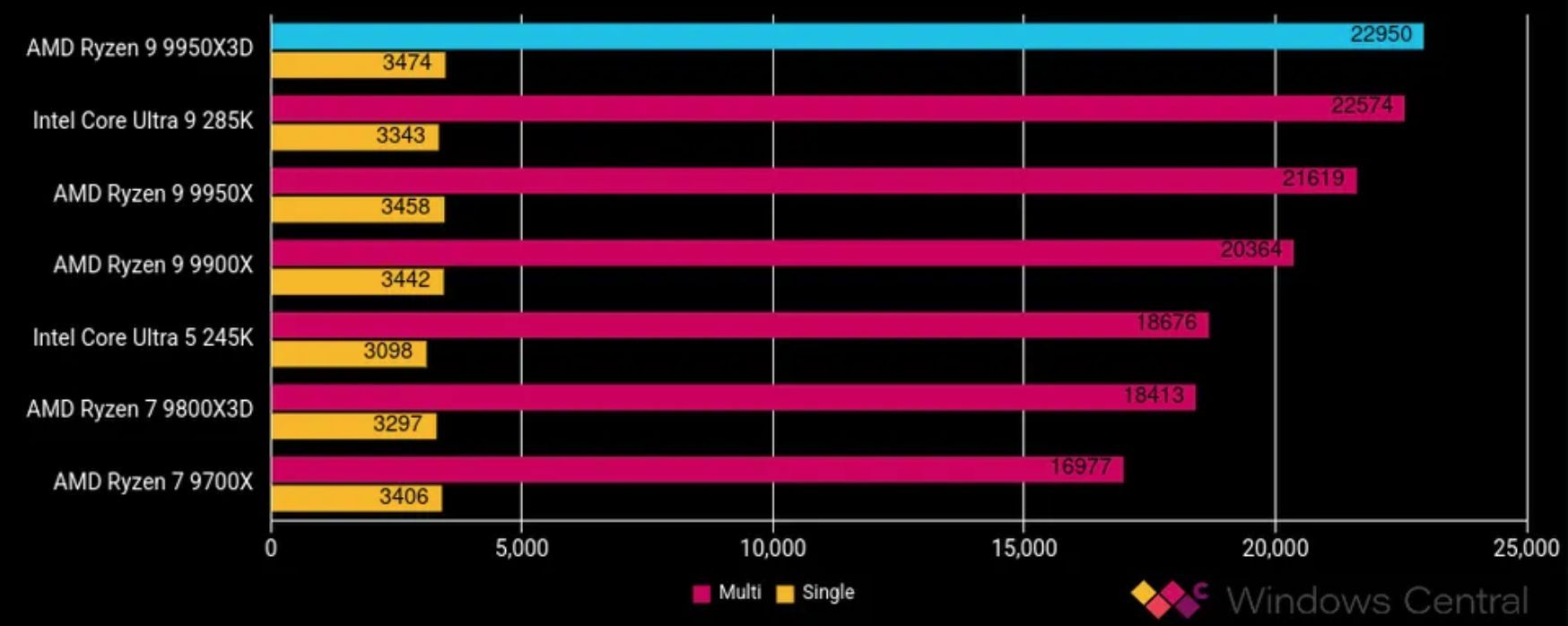 Wydajność wielordzeniowa jest o około 5,22% lepsza od wydajności jego odpowiednika bez procesora X3D, natomiast jednordzeniowa pozostaje praktycznie niezmieniona w porównaniu z procesorem Ryzen 9 9900X.