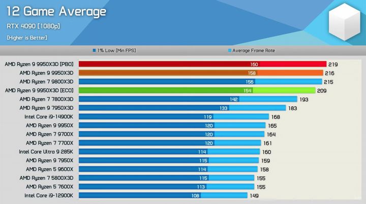 Ponadto, AMD Ryzen 9 9950 X3D sprawuje się niemal identycznie, co Ryzen 7 9800 X3D. Na to wskazują również pomiary wykonane przez Hardware Unboxed. Uśredniony wynik z 12 różnych tytułów, uruchomionych w rozdzielczości 1080p na karcie graficznej RTX 4090, pokazuje, że oba procesory oferują bardzo zbliżoną do siebie wydajność.