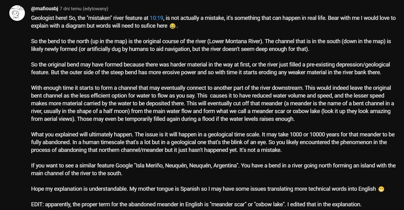 Tezę youtubera podważył widz o pseudonimie „mafiousbj”, powołując się na swoje doświadczenie w zawodzie geologa. Jego zdaniem wcale nie musi to być błąd, jeśli północna odnoga powstała w sposób naturalny (np. sprzyjał jej podatny grunt), a południową stworzył człowiek. Widz potwierdził, że meander po pewnym czasie powinien zniknąć, jednak może mu to zająć od tysiąca do nawet 10 tysięcy lat.