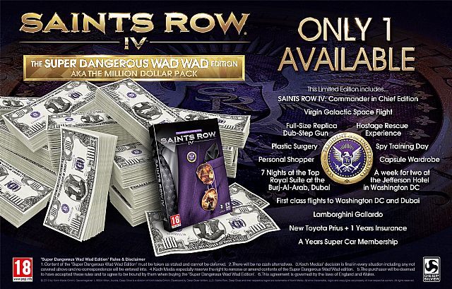 Firma Deep Silver i studio Volition przeszli samych siebie. Po edycjach Commander in Chief, Super Dangerous Wub Wub Edition i Emperor Zinnyak’s Game of the Generation Edition przyszedł czas na najbardziej „dopakowane” i dość niecodzienne, eufemistycznie to ujmując, kolekcjonerskie wydanie gry Saints Row IV. Przy Super Dangerous Wad Wad Edition wszystkie poprzednie wypadają bardzo blado. Niestety, są dwa „ale”. Po pierwsze, istnieje tylko jeden taki egzemplarz, a po drugie kosztuje „skromne”… milion dolarów. Co takiego znajduje się w zawartości, że cena wynosi aż tyle?