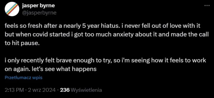 Jak wyglądało ponowne rozpoczęcie pracy nad omawianym projektem? W pierwszej kolejności Byrne zmniejszył posiadane pliki gry z 60 GB do zaledwie 1,5 GB. W następnych wpisach twórca konsekwentnie informował o dalszych krokach, w tym powiadomił nas o podzieleniu się tworzonym światem z kimś, kogo opinia dla niego „wiele znaczy”.