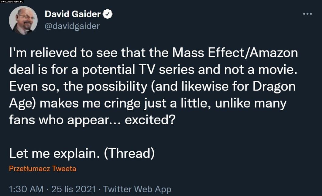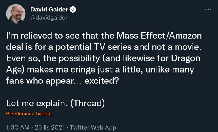 Według wczorajszych doniesień, Amazon podobno jest o krok od rozpoczęcia realizacji serialowej adaptacji marki Mass Effect. David Gaider, główny scenarzysta dotychczasowych odsłon serii Dragon Age, który opuścił studio BioWare w styczniu 2016 roku, wyraził na Twitterze swoje obawy odnośnie tego projektu: