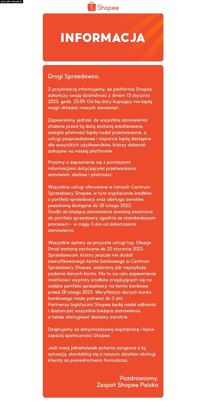To właśnie podana powyżej data jest ostatecznym dniem, w którym Shopee zaprzestanie działalności w Polsce. Zamówienia złożone przed 13 stycznia 2023 r. godz. 23:59 zostaną normalnie zrealizowane.