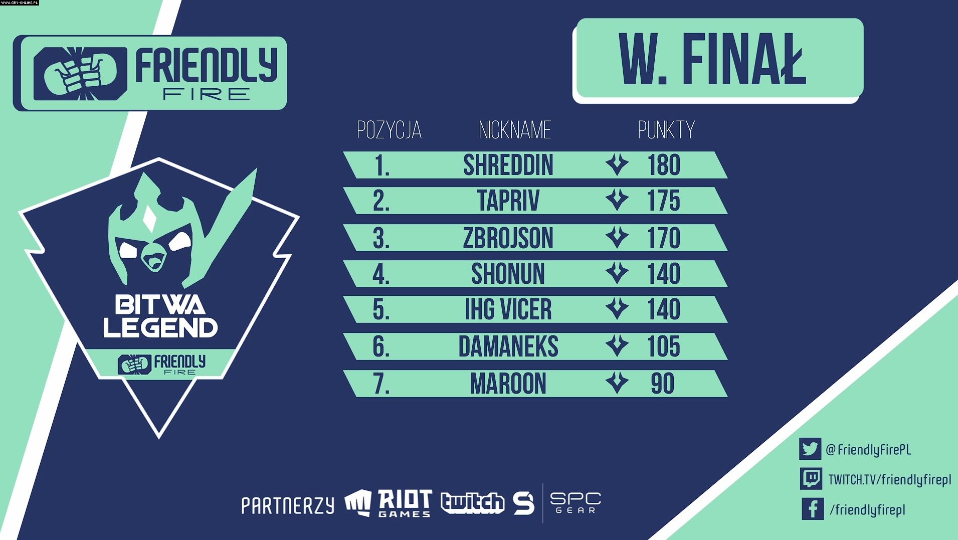 W ostatnią niedzielę odbył się Wielki Finał Bitwy Legend Friendly Fire w grze Teamfight Tactics, którą zorganizowaliśmy we współpracy z firmą Riot Games. Po niezwykle wyrównanej walce (zaledwie pięć punktów różnicy między pierwszym a drugim miejscem) po zwycięstwo sięgnął Shreddin. Szczegółowe wyniki zmagań znajdziecie na grafice poniżej, a zapis transmisji z finału pod tym adresem. Przygotowaliśmy dla Was także krótką rozmowę ze zwycięzcą – Szymonem „Shreddinem” Jakubowskim – którą przeczytacie w dalszej części tej wiadomości.