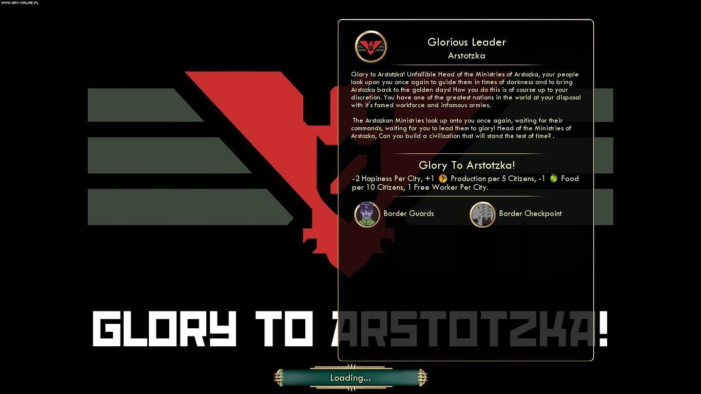 Silną stroną gier podpiętych pod steamowy Warsztat jest ogrom łatwo dostępnych modyfikacji, które tworzą fani danego tytułu. Instalacja jest zazwyczaj bezproblemowa, można też szybko je przejrzeć i błyskawicznie zdecydować, co chcielibyśmy poprawić lub rozszerzyć w naszej grze. Dzisiaj opisujemy mod, który można nazwać żartobliwie „transgrowym”, gdyż do Sid Meier's Civilization V wprowadza nową nację, znaną z innej gry – wysoko ocenianej produkcji niezależnej Papers, Please. Autorem rozszerzenia Glory to Arstotzka! jest użytkownik Snakeeater337. Aby móc poprowadzić obywateli Arstotzki ku świetlistej przyszłości, trzeba posiadać rozszerzenie Brave New World, drugi pełnoprawny dodatek do Civilization V.