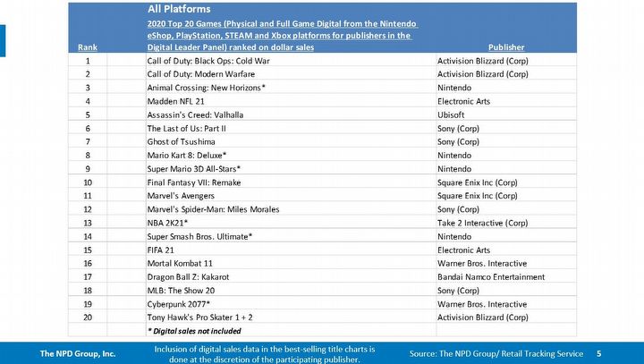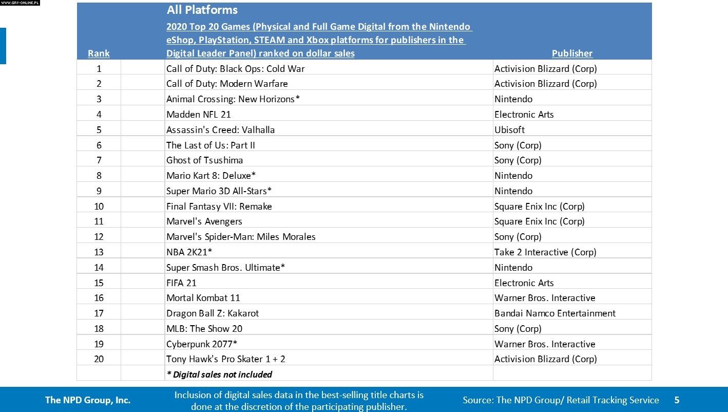 Również w Ameryce Północnej Nintendo wysunęło się na prowadzenie, choć nie aż tak jak w Japonii. W USA wydatki na gry wyniosły łącznie 56,9 miliarda dolarów, zaliczając wzrost o 27% z roku na rok. Większość z tego (86%) przyniosło oprogramowanie, tak cyfrowe, jak i kupowane w pudełkach. W tej kategorii Call of Duty ponownie nie dało szans konkurencji, zajmując pierwszą (oraz drugą) pozycję na liście najlepiej sprzedających się gier rekordowy dwunasty rok z rzędu. CoD: Black Ops – Cold War królował także w grudniu, wyprzedzając Cyberpunka 2077 (aczkolwiek analitycy NPD nie uwzględnili danych ze sprzedaży cyfrowej) oraz Assassin’s Creed: Valhalla. Wypada też wspomnieć o The Last of Us: Part II, które zostało trzecią najlepiej sprzedającą się produkcją Sony w USA, tuż za Spider-Manem oraz God of War.