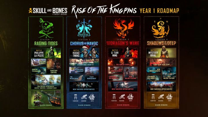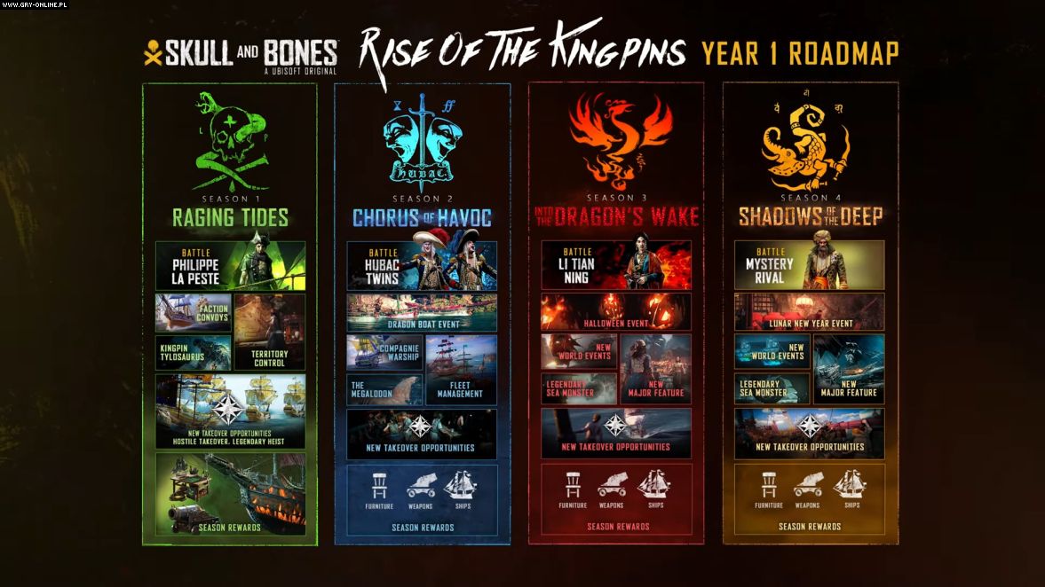 Z powyższego filmu dowiedzieliśmy się, że w ciągu 12 miesięcy od debiutu Skull and Bones czekają nas cztery sezony – nazwane: Raging Tides, Chorus of Havoc, Into the Dragon’s Wake, Shadows of the Deep – z potężnymi pirackimi lordami do pokonania. Jednocześnie będziemy budować swoją legendę na wypełnionych rozbójnikami wodach.
