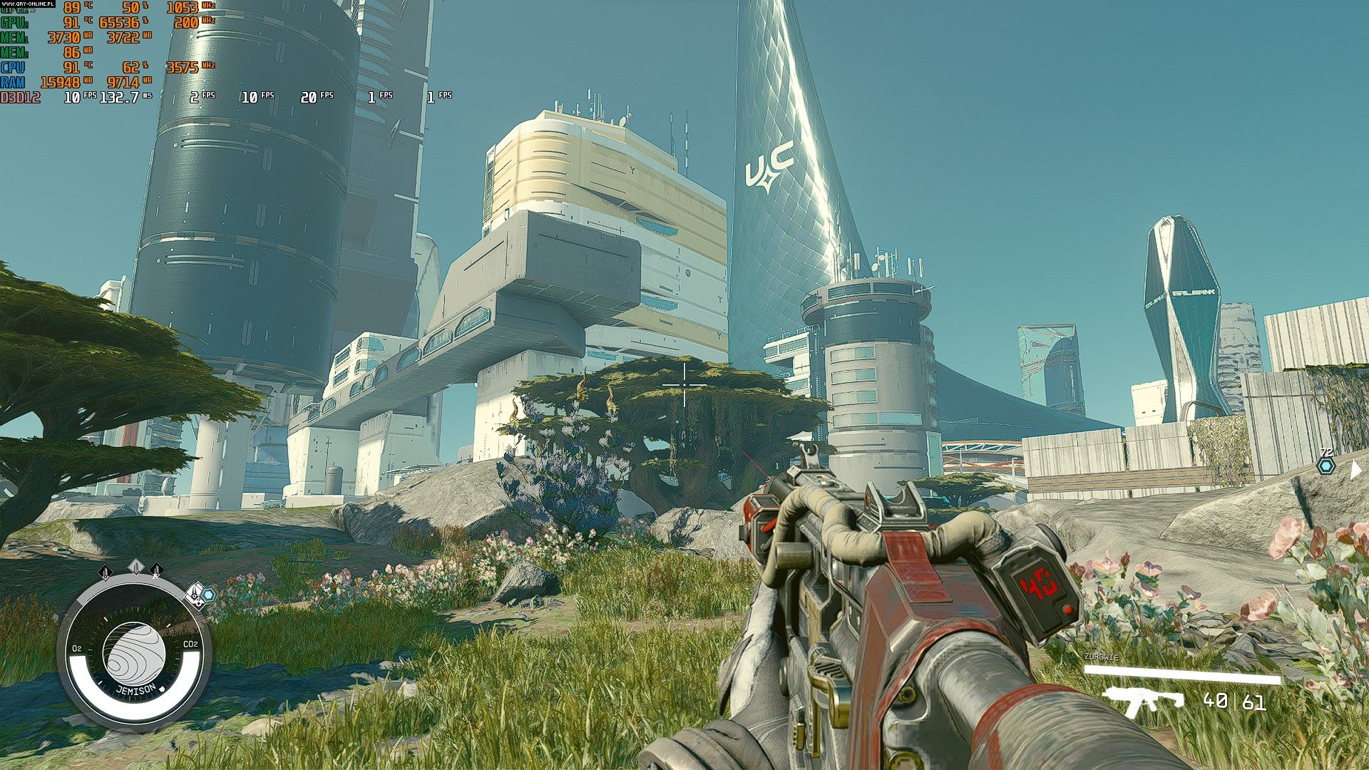 Jak wspomniałem na początku, bohaterem tekstu są Starfield oraz mój ponad sześcioletni laptop ASUS TUF FX505DY z kartą graficzną AMD Radeon RX560x, procesorem Ryzen 5 3550H oraz 16 GB RAM-u na pokładzie. Do wykonania pomiarów użyłem popularnego narzędzia MSI Afterburner. Dodam też, że zastosowałem się do Waszych porad, zamieszczonych pod tekstem o Baldur’s Gate 3, dlatego też pozbyłem się zbędnych wskaźników i włączyłem te, które Was interesowały. Zatem gdzie pojawiły się pierwsze przeszkody w grze? A no, niestety bardzo szybko, bo już na samym starcie.