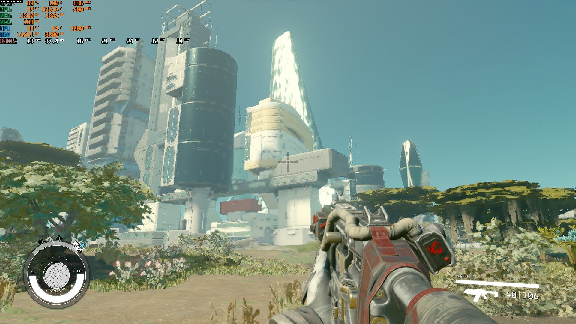 Tak prezentuje się Starfield na najniższych ustawieniach graficznych wraz z pomiarami z AfterburneraŹródło: własne