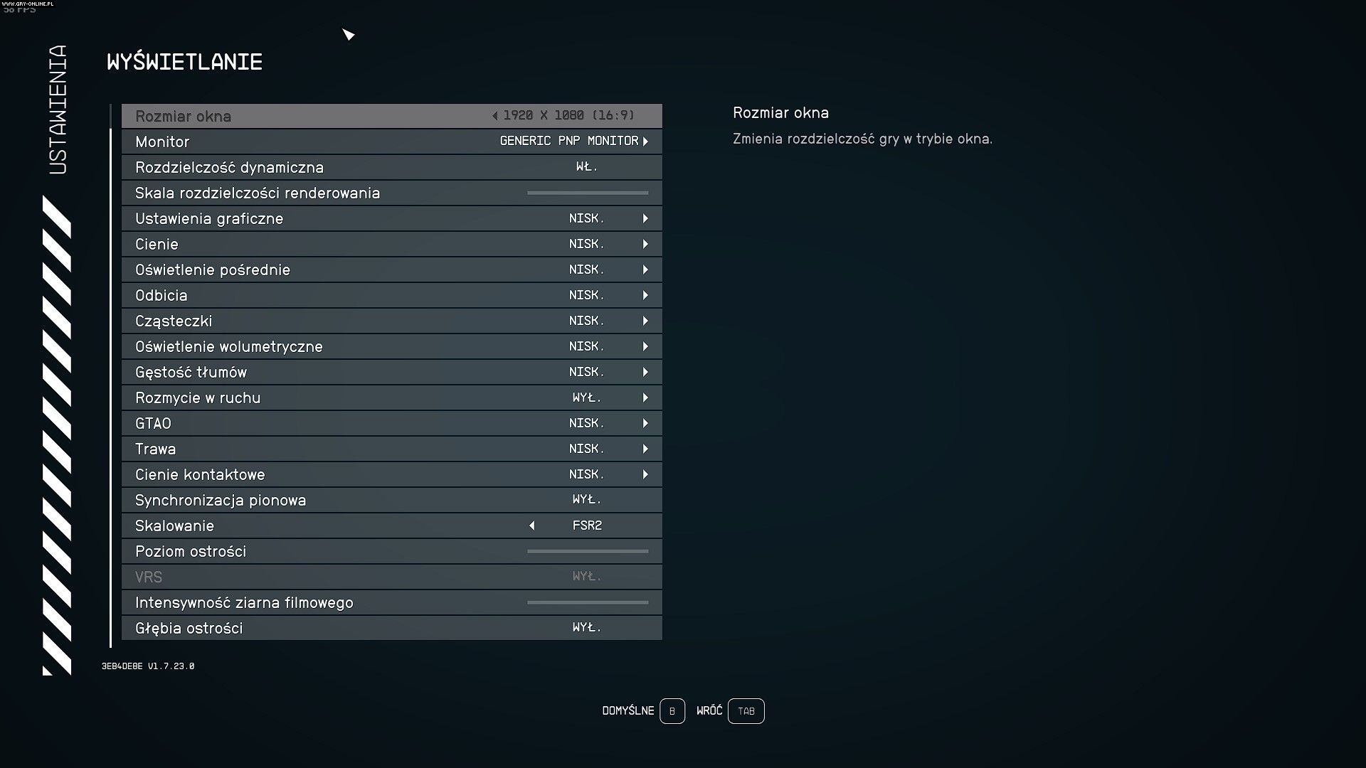 Produkcja ostatecznie się uruchomiła, przywitał mnie ekran startowy i rozpoczęło się kompilowanie shaderów, które swoją drogą trwało krócej, niż się tego spodziewałem, bo zaledwie niecałe 2 minuty. Po tej trudnej przeprawie dotarłem do menu i czym prędzej przeszedłem do sekcji opcji wyświetlania, gdzie niestety przywitały mnie domyślne niskie ustawienia graficzne, rozdzielczość 1920 x 1080 pikseli i włączoną techniką FSR 2.0 z najniższym poziomem ostrości (50%). Przy tym zaznaczę, że zmiana rozdziałki, aby podnieść liczbę klatek na sekundę, nie wchodzi w grę, ponieważ Starfield oferuje wyłącznie zabawę w trybie borderless fullscreen albo okienkowym. W tym drugim przypadku możecie sobie zatem wyobrazić komfort rozgrywki w malutkim kwadraciku, wiszącym w rogu Waszych ekranów.