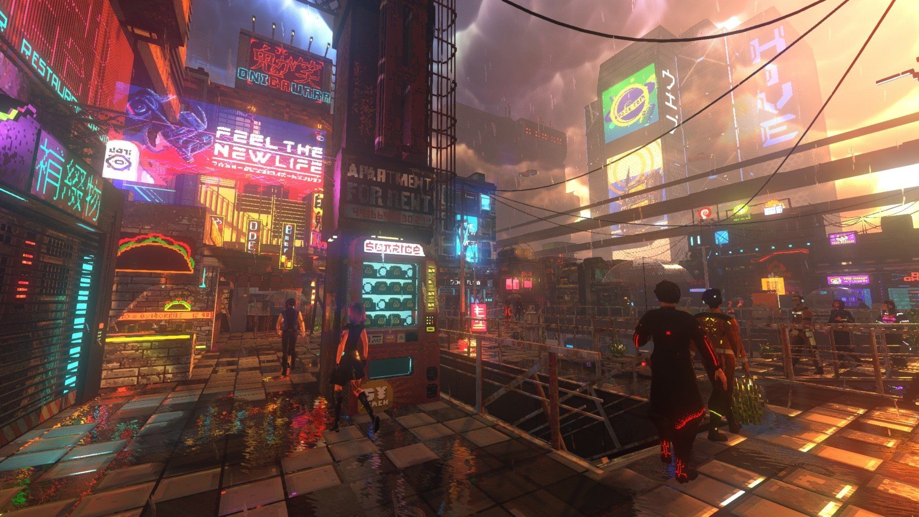 Ponadto, jak dowiadujemy się z FAQ – gra będzie miała widok pierwszoosobowy, a twórcy póki co nie planują wsparcia dla Steam Decka (z ich wypowiedzi wynika jednak, że w dalszej przyszłości może się ono pojawić). Nie zakładają też na razie wersji na Maca. Gracze mogą zaś liczyć na różne efekty pogodowe, takie jak deszcz i śnieg czy burze i mgła, które urozmaicą słoneczne dni w tytułowym cyberpunkowym mieście.