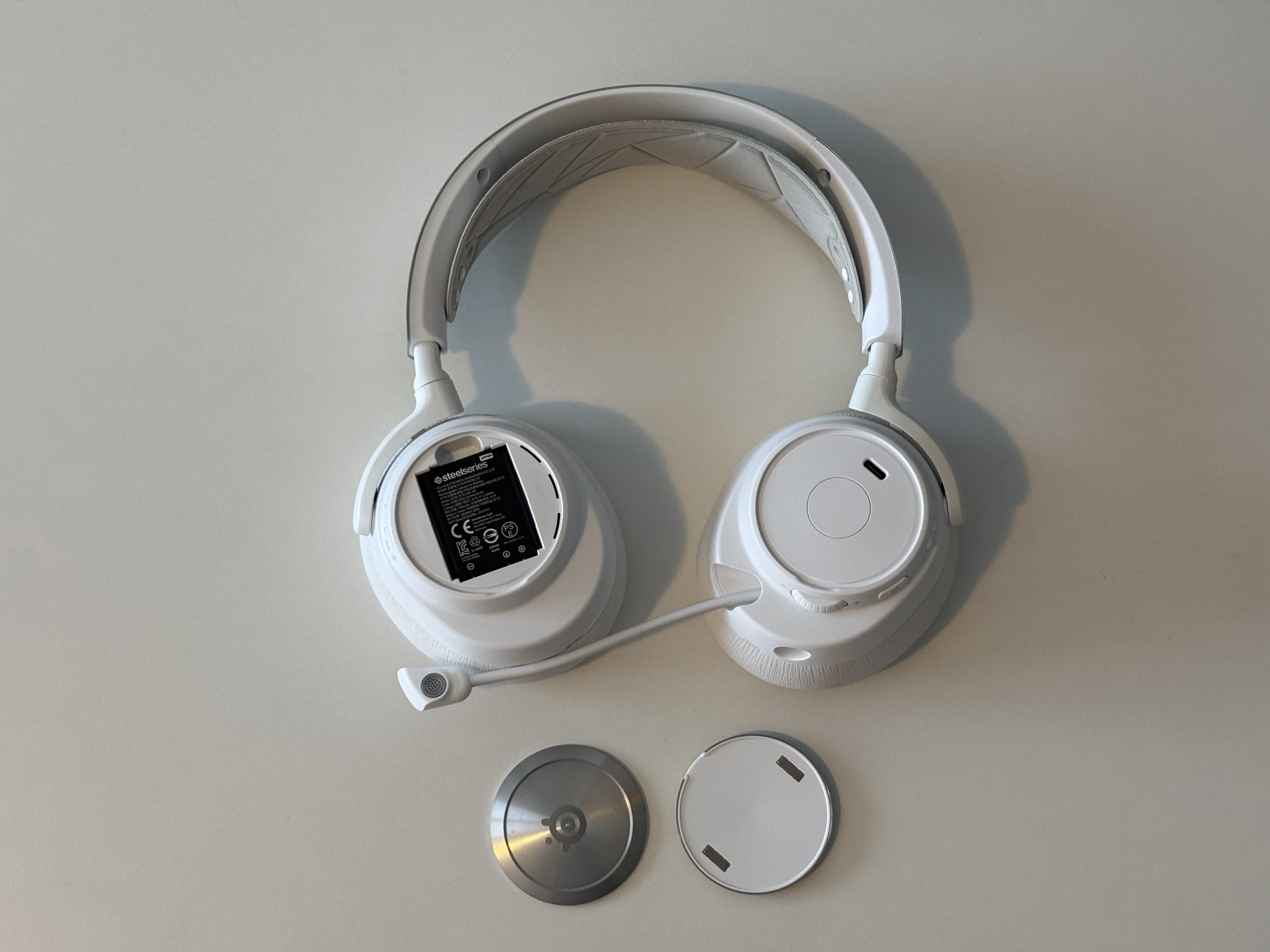 SteelSeries Arctis Nova Pro Wireless mają w rękawie asa, który pozwala teoretycznie grać bez żadnych przerw. Działa to tak, że w słuchawkach macie wymienną baterię kryjącą się za klapką, a drugą baterię trzymacie w bazie ładującej. W teorii, gdy ta aktywna się rozładuje, sięgacie po świeżo naładowaną baterię z bazy. W praktyce jednak nie zawsze to działało.