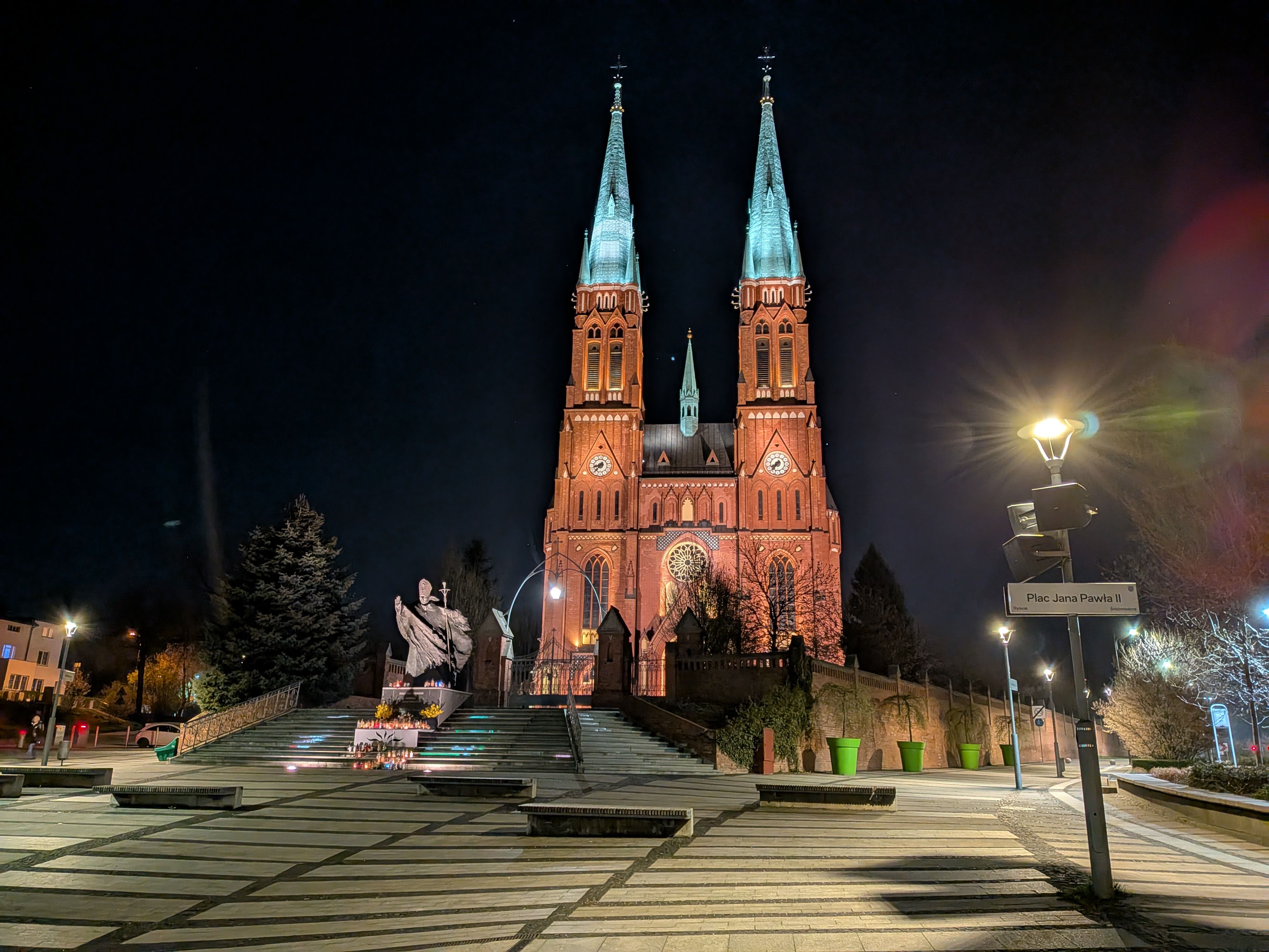 Fotografia nocna daje radę, choć w przypadku mocniejszych źródeł światła (w tym przypadku latarnia) efekty nie są idealne. Finalnie będziemy w stanie jednak zrobić niezłe zdjęcia po zmierzchu, ale przede wszystkim głównym aparatem.