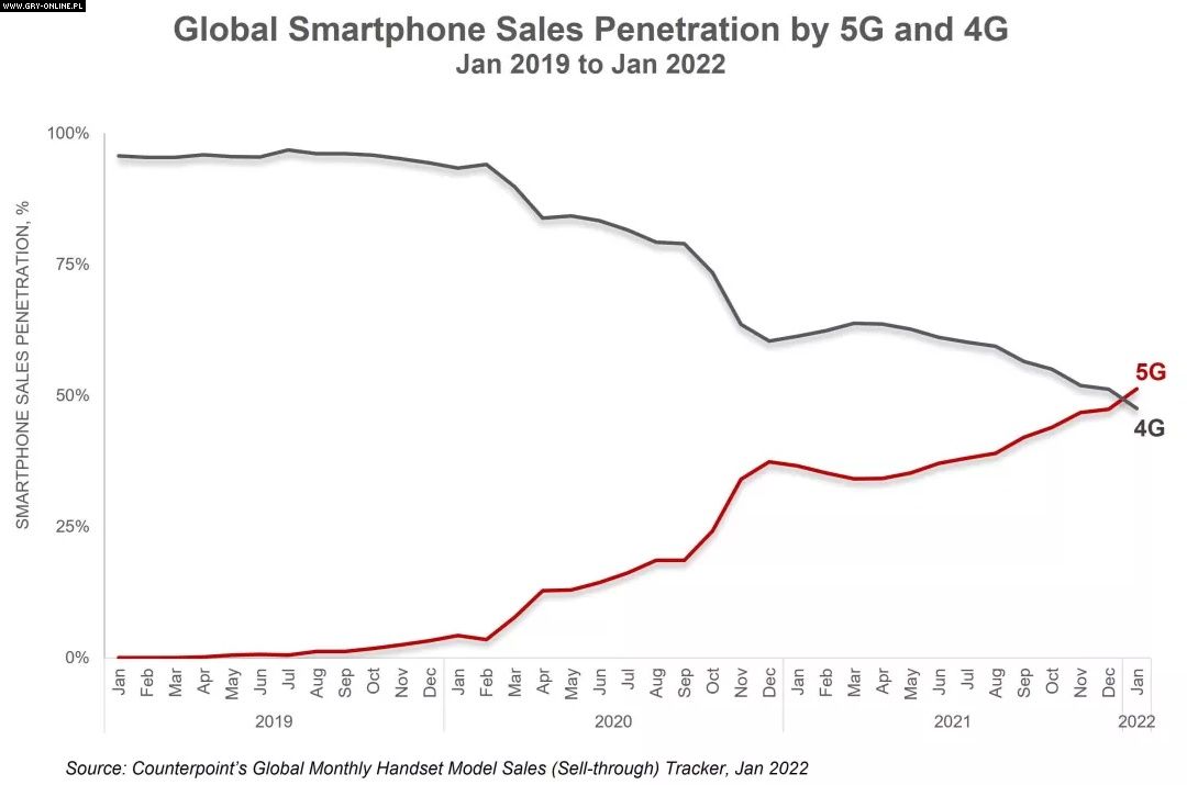 51% smartfonów sprzedanych w styczniu 2022 roku posiadało modem 5G. Wydaje się, że główna w tym zasługa firmy Apple, która przeszła na 5G wraz 12. generacją iPhone’a.