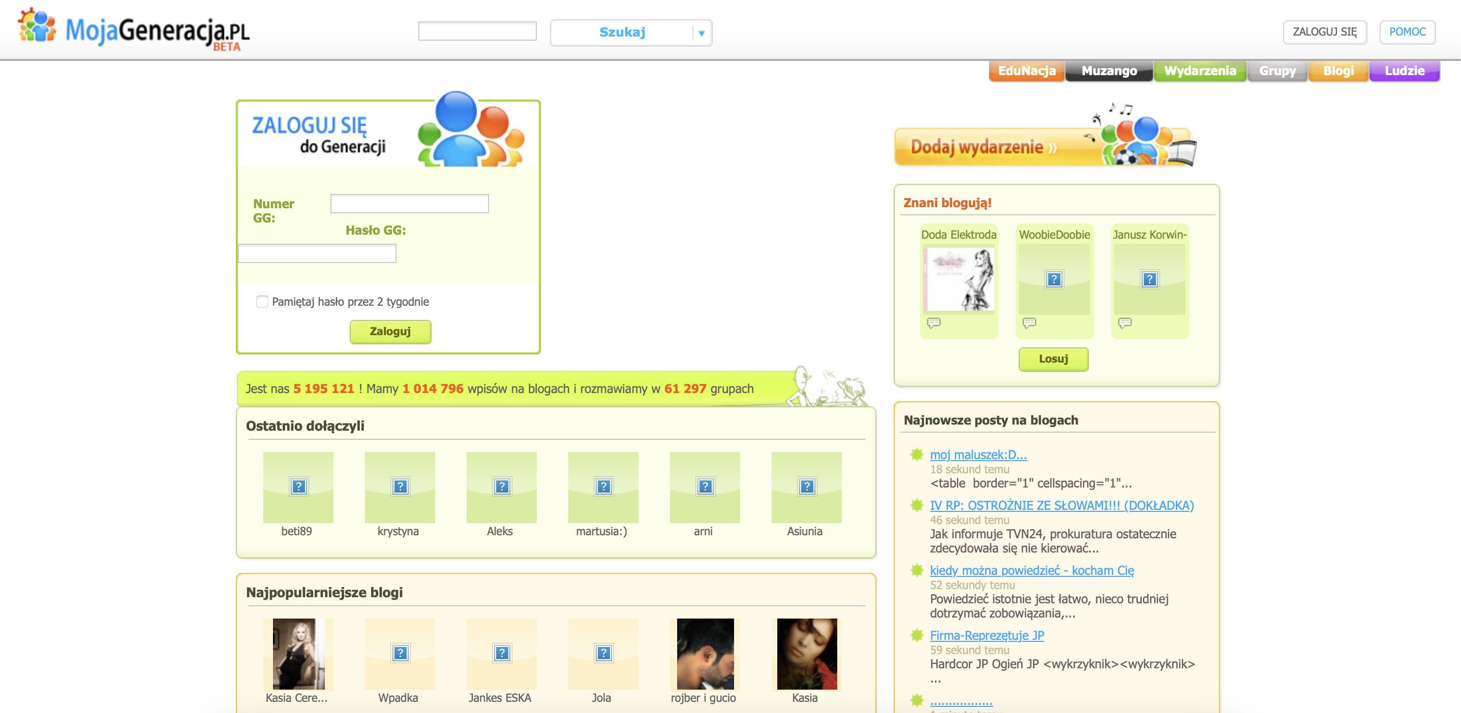 Strona Moja Generacja - portal ściśle powiązany z GG. Logowanie nawet było przez numer i hasło do komunikatora.Źródło: web.archive.