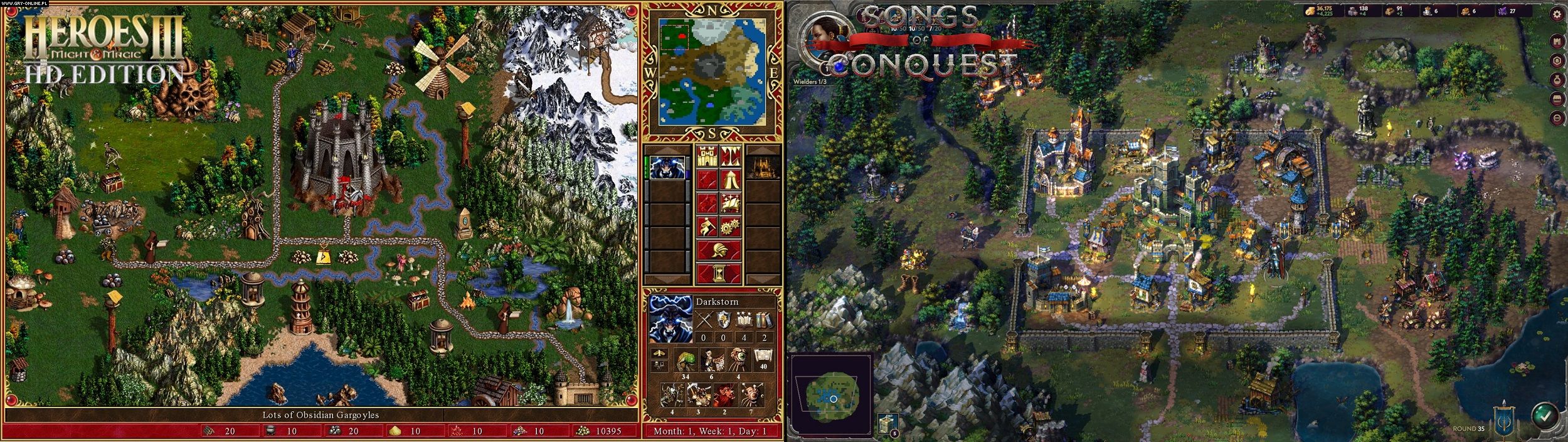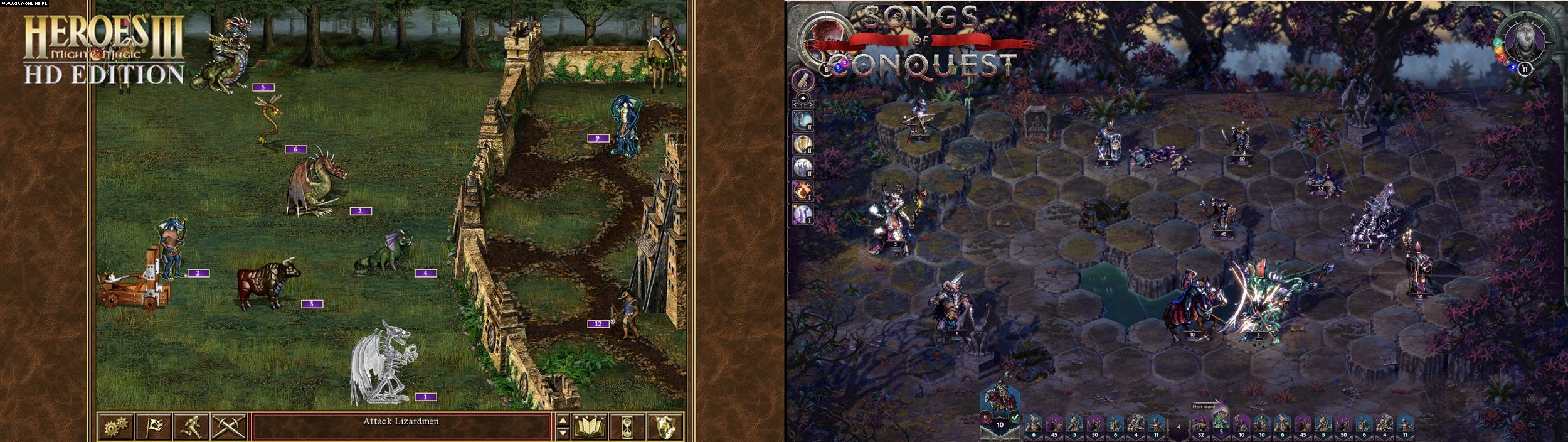 Songs of Conquest może korzystać ze stylu retro pełnego pikseli, ale deweloper zadbał o dodanie efektów wizualnych, jakich próżno szukać w trzecich Heroesach. Również interfejs musiał zostać zmodernizowany, by nie odstraszać graczy ekranami rodem z końcówki XX wieku. Mimo to ogólna charakterystyka obu gier wydaje się zbliżona – pola bitew podzielone na heksy, perspektywa mapy strategicznej, proporcje obiektów, wygląd dróg czy lasów etc.