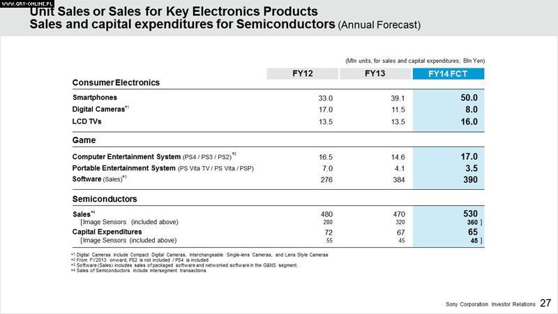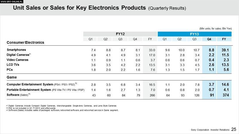 Dowiedzieliśmy się również, że łączna sprzedaż konsol PlayStation 4 oraz PlayStation 3 w ubiegłym roku fiskalnym osiągnęła poziom 14,6 milionów sztuk. Znacznie mniejszym zainteresowaniem cieszą się platformy przenośne firmy Sony. PlayStation Vita, PlayStation Vita TV oraz PSP rozeszły się w łącznym nakładzie 4,1 milionów sztuk. Z kolei ogólna sprzedaż gier i ogólnie pojętego oprogramowania na te platformy sprzętowe wyniosła 374 miliony egzemplarzy.