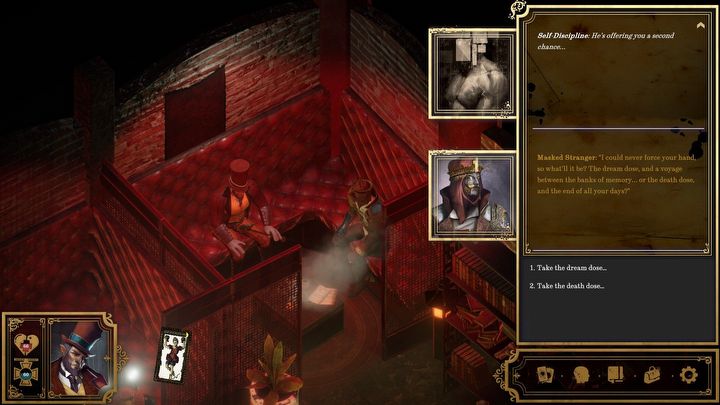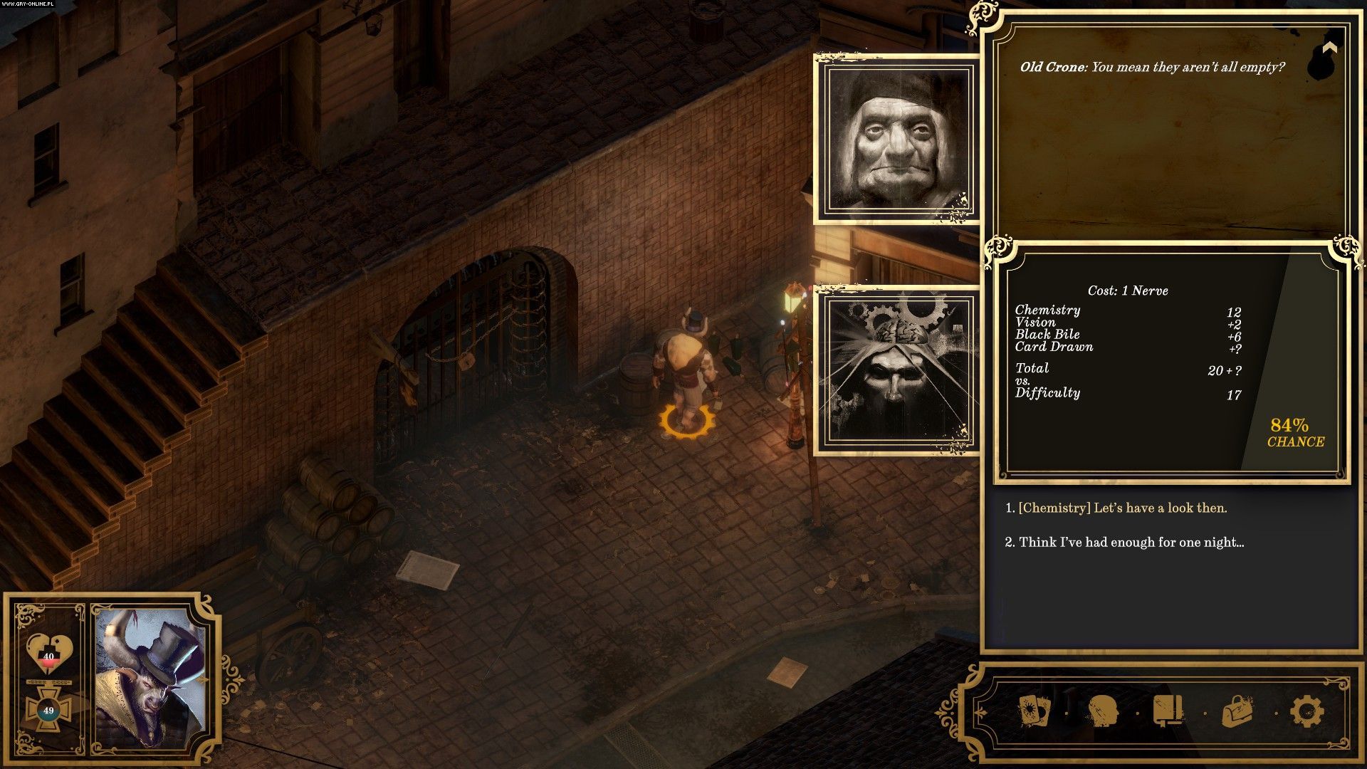 Nie myślcie jednak, że mamy do czynienia z bezmyślną zrzynką z Disco Elysium. Crimson Herring Studios ma też trochę własnych pomysłów na rozgrywkę. Dotyczy to zwłaszcza wykonywania testów – zamiast rzucać kośćmi, ciągniemy karty (które mogą mieć dodatni lub ujemny modyfikator), a do tego występuje tu tarot, zapewniający bohaterowi rozmaite efekty. Podobnie działają humory, których poziom zmienia się w zależności od wybieranych opcji dialogowych. Ponadto używanie umiejętności – których jest łącznie 25 – przekłada się na rozwój każdej z nich.