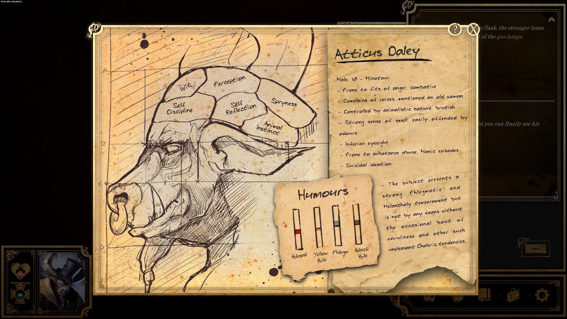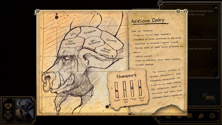 Podobieństwa do Disco Elysium rzucają się w oczy od pierwszych chwil gry. Bohater – minotaur notabene – budzi się w zaułku po wytężonej libacji, a kolumna tekstu po prawej stronie ekranu ukazuje nam wewnętrzny dialog, w którym różne cechy czy też zmysły postaci prowadzą spór w jej głowie, przy okazji dostarczając nam informacji o otoczeniu i sytuacji. Co istotne: teksty są napisane porządnie, klimatycznie – choć o lekkości pióra z pierwowzoru nie ma mowy.
