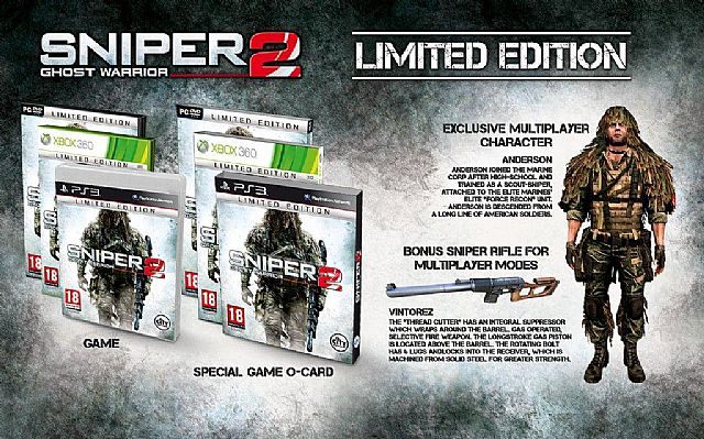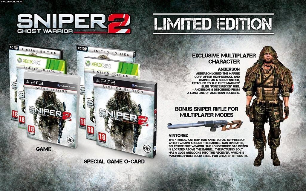 Dla mniej zamożnych entuzjastów marki przewidziano edycję limitowaną. Sniper: Ghost Warrior 2 – Limited Edition kosztować ma 39,90 euro. Edycja ta będzie się różnić od standardowej wytłaczaną obwolutą pudełka z grą oraz bonusowymi materiałami DLC do rozgrywki wieloosobowej (dodatkowy karabin i bohater).
