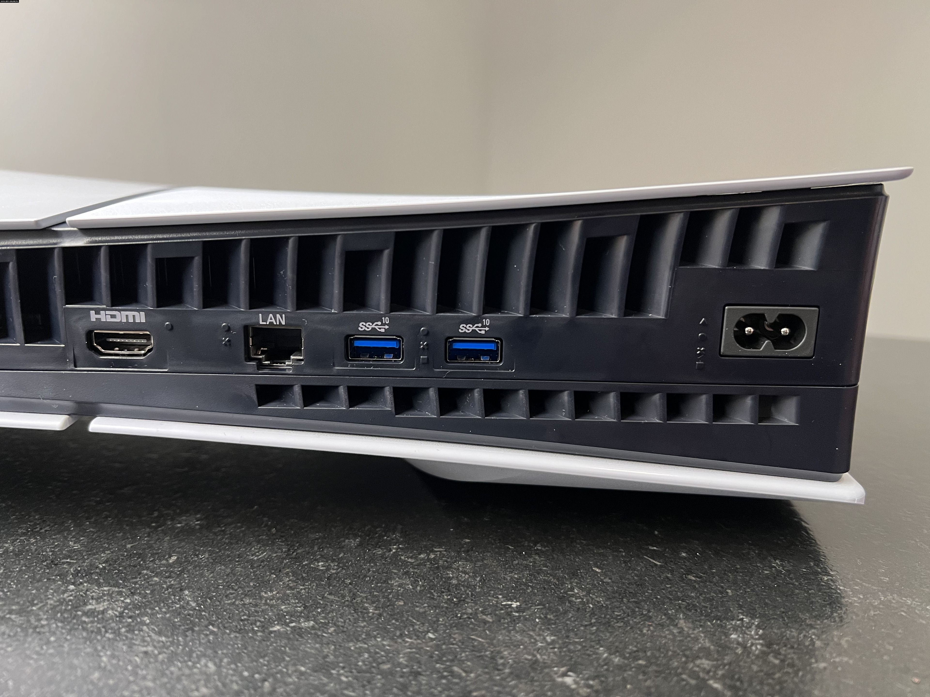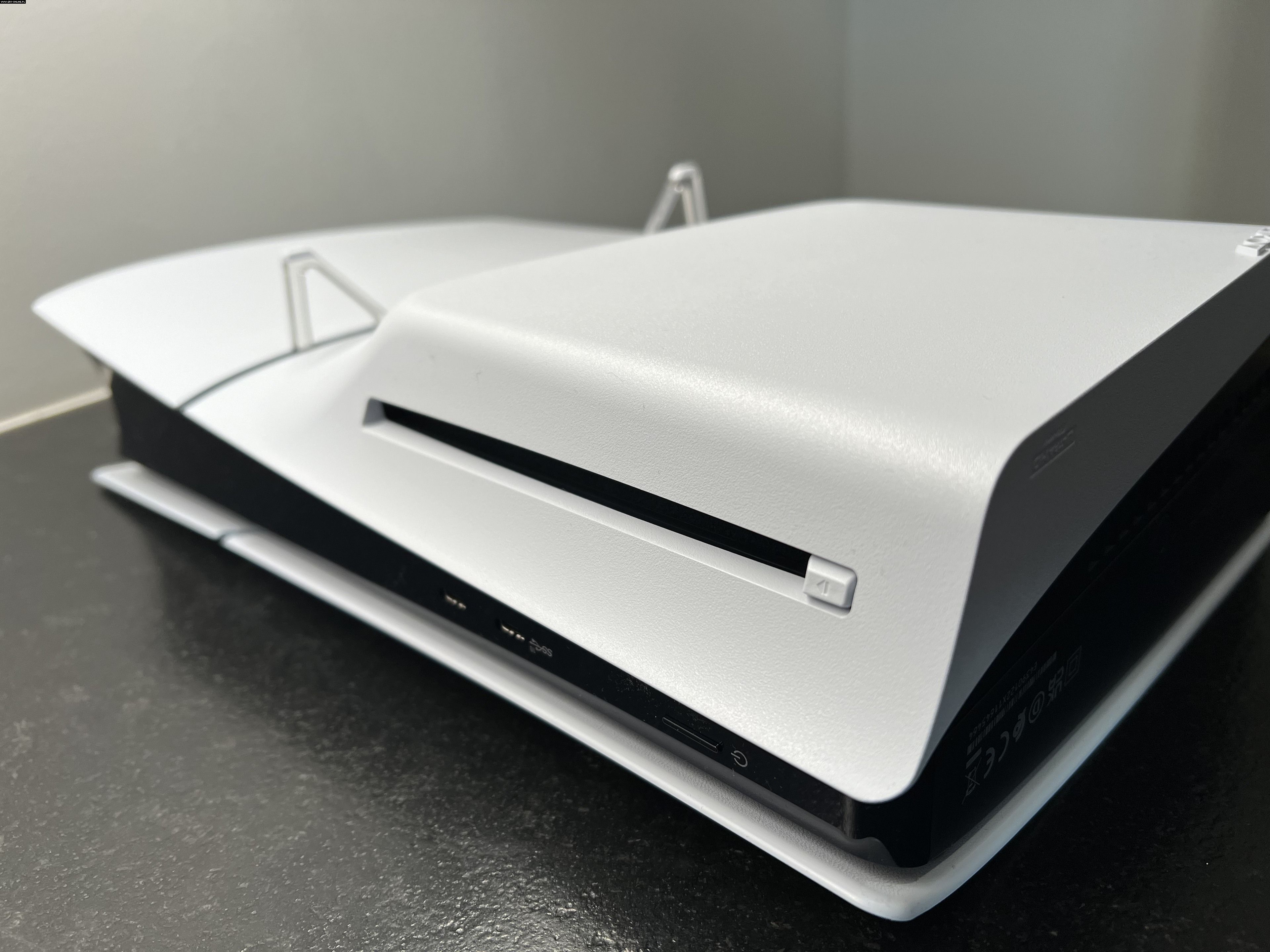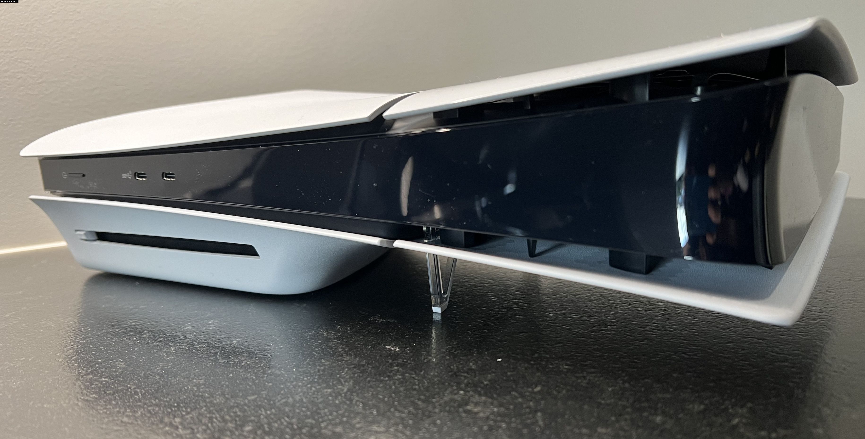 Ciekawostką są wspomniane nóżki, które są po prostu niewielkimi kawałkami plastiku przypominającymi po zamontowaniu kocie uszka. W przeciwieństwie do podstawki dołączanej do poprzednich wersji PS5, nóżki wymuszają poziome ułożenie konsoli. To duża zmiana na minus i trudno mi wytłumaczyć ją inaczej niż próbą wygenerowania większych przychodów. W końcu oficjalna podstawka umożliwiająca pionowe ustawienie PlayStation 5 Slim kosztuje blisko 130 złotych. Nie otrzymaliśmy jej do testów, nie mogłem więc sprawdzić, czy jest ona warta swej ceny. Mam jednak pewne podejrzenia, że nie.
