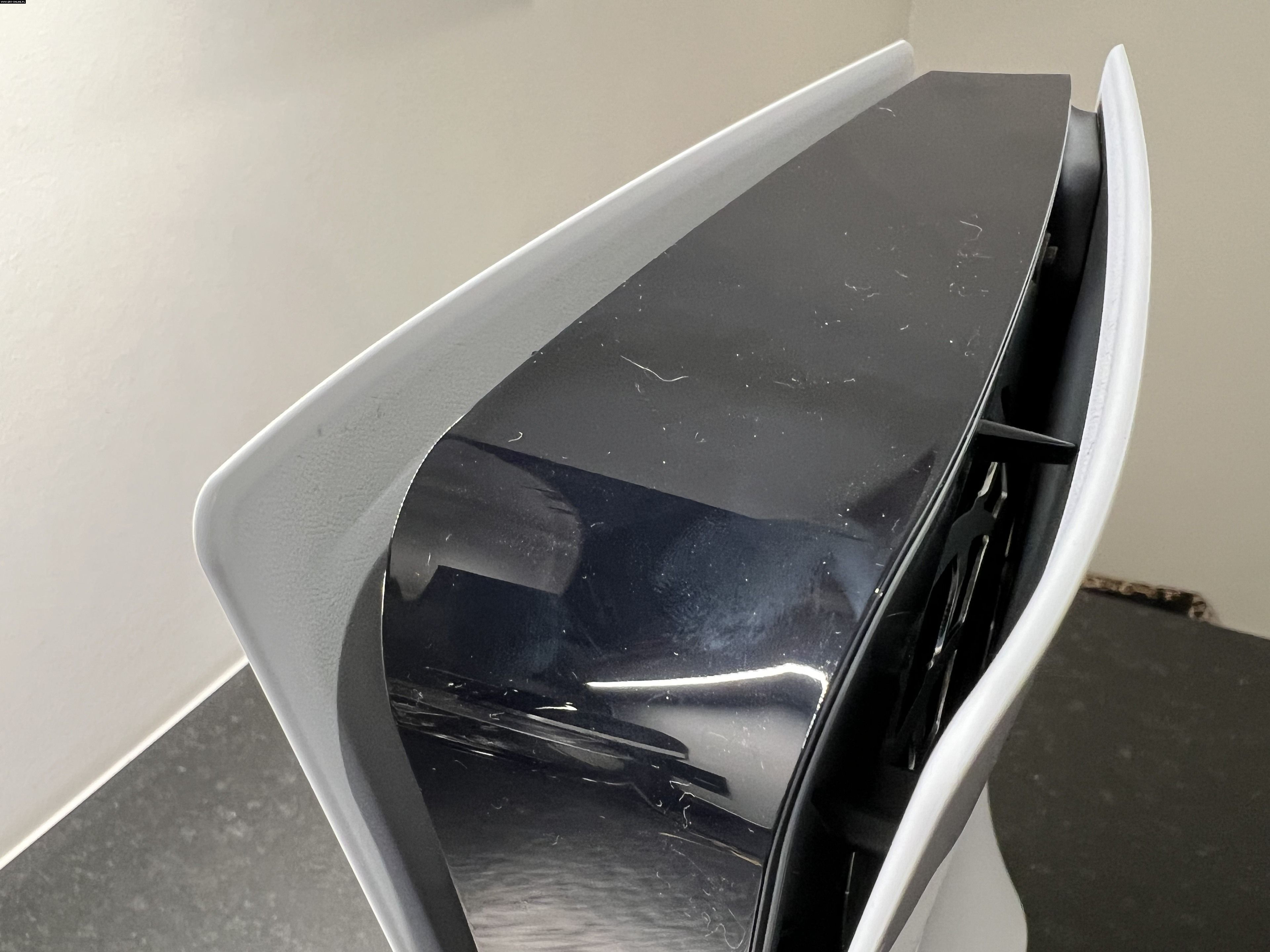 Nie zmienił się przede wszystkim ogólny koncept na konsolę. To wciąż są boczne panele okalające czarny błyszczący rdzeń konsoli, biegnący od góry przez cały front. Tak jak wspomniałem, ten środkowy fragment konsoli nadal ma problem ze zbieraniem odcisków palców i kurzu. Nie testowałem odporności na zarysowania, ale wszystko wskazuje na to, że mogą pojawić się rysy, zwłaszcza wokół wejść USB.