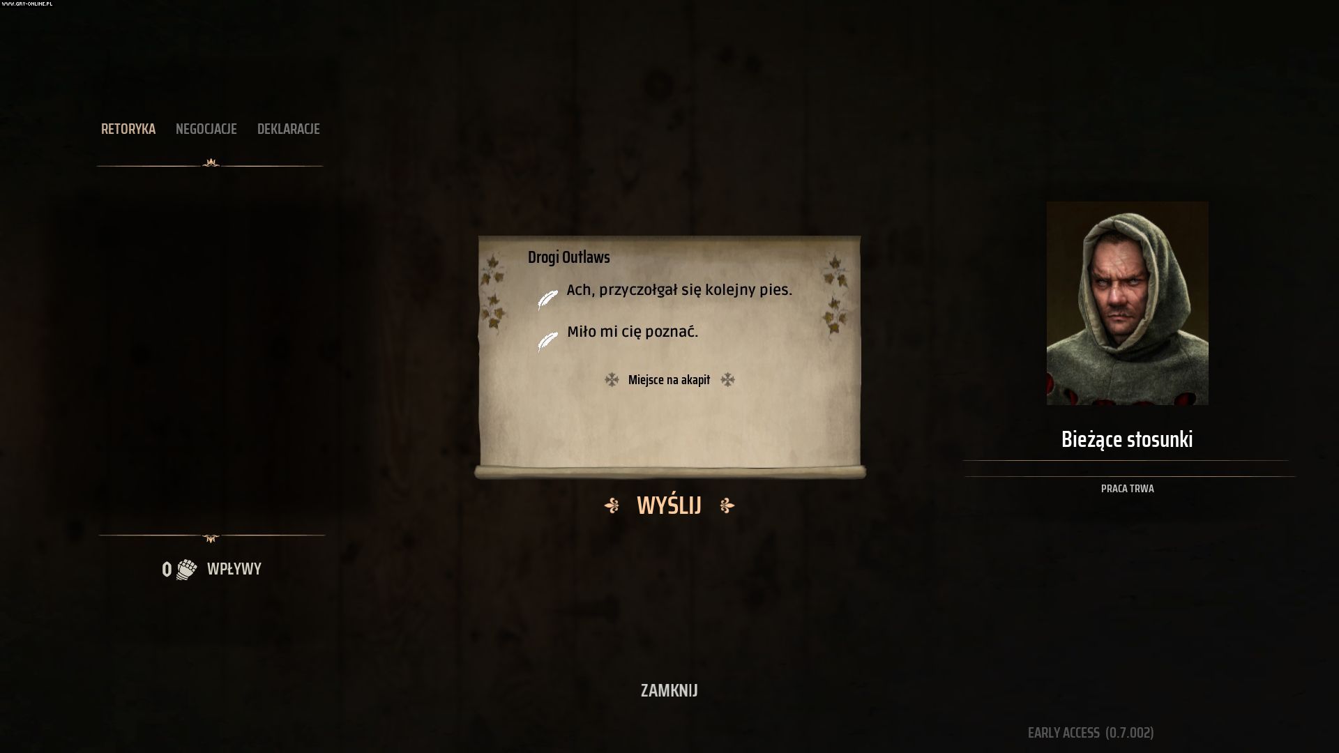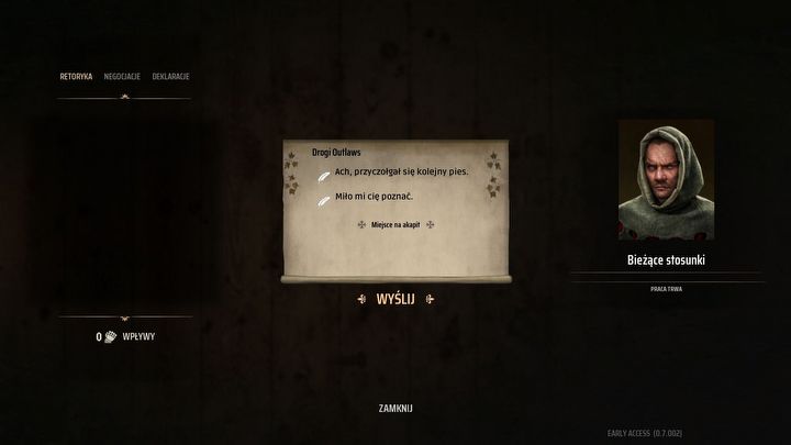 Dyplomacja na razie pozostaje w powijakach, ale można już wymieniać się miłymi liścikami z rozbójnikami.Manor Lords, Hooded Horse, 2024.