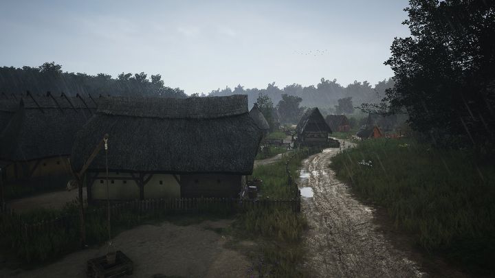 Zastanawiająco dużo czasu spędzamy tu w ulewnym deszczu. Zbytnio to jednak nie przeszkadza, bo błotniste drogi wyglądają świetnie.Manor Lords, Hooded Horse, 2024.