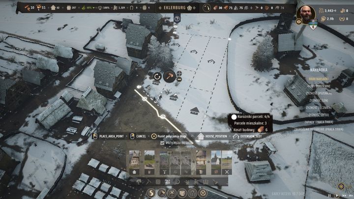 Jeśli jednak chcielibyśmy przechwalać się przed sąsiadem, że nasi chłopi mają większe domy niż on, możemy łatwo dostosować planowane osiedle i zamiast ośmiu szeregówek zbudować dwie wiejskie chaty z pokaźnym obejściem. Obszar zabudowy precyzyjnie zaznaczamy na mapie, więc spokojnie – chłopi nie zajmą terenu, na który nie dostaną zezwolenia.