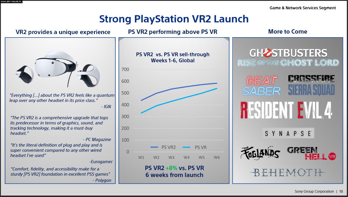 Osobnej wzmianki doczekały się poszczególne gamingowe urządzenia korporacji. Dokument zaznacza dla przykładu, że wydane w lutym gogle PS VR2 sprzedały się tylko nieco lepiej od poprzedniego modelu, osiągając w 6 tygodni pułap około 600 tys. egzemplarzy.