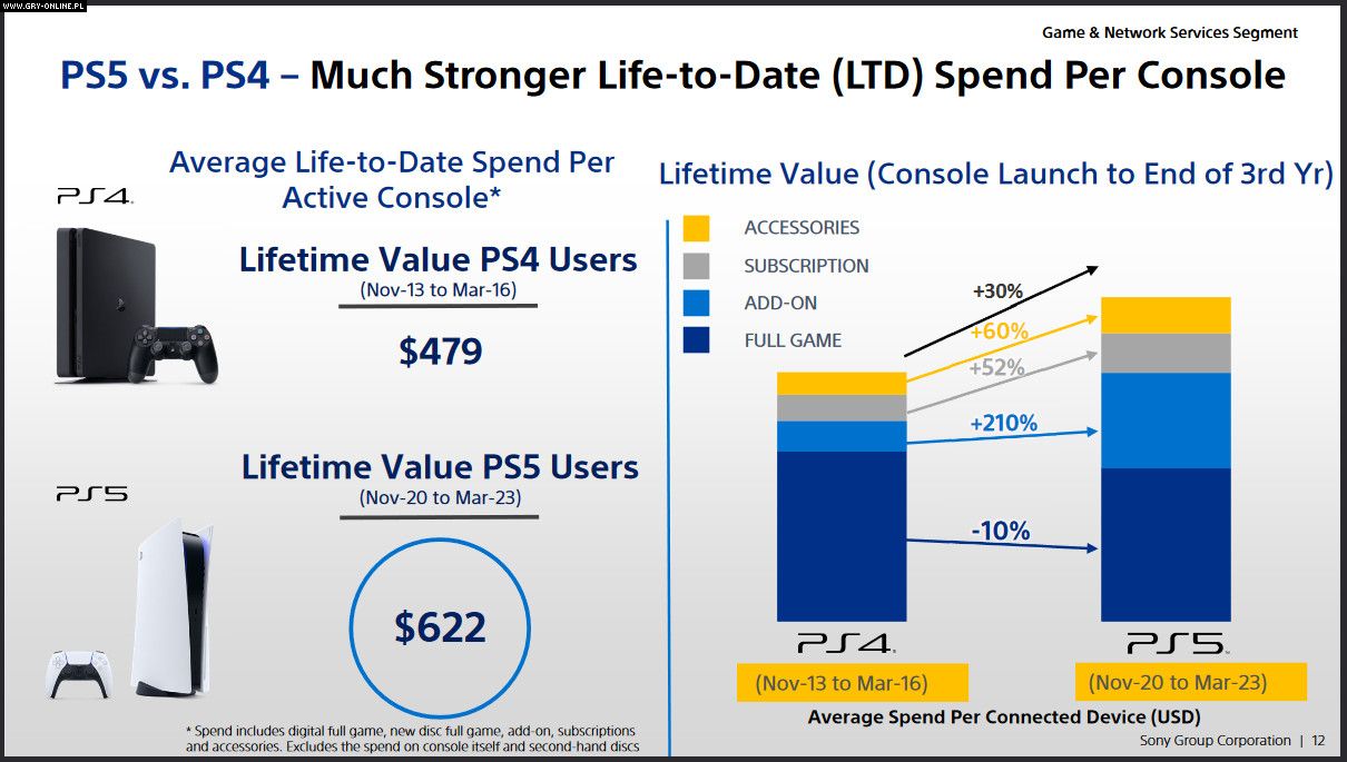 Co ciekawe, użytkownicy PS5 wydają na sprzęt, gry i akcesoria znacznie więcej pieniędzy od posiadaczy PS4 (licząc pierwsze trzy lata od premiery) – 622 dolary w porównaniu do 479 dol. Sony ujawniło również, że PS5 ma wyprzedzić PS4 we "wszystkich kluczowych wskaźnikach" do końca roku podatkowego 2023. Wskaźniki te obejmują gry (fizyczne, cyfrowe), dodatki, subskrypcje (PS Plus), kontrolery, VR, ale i nie obejmują zakupu samej konsoli.