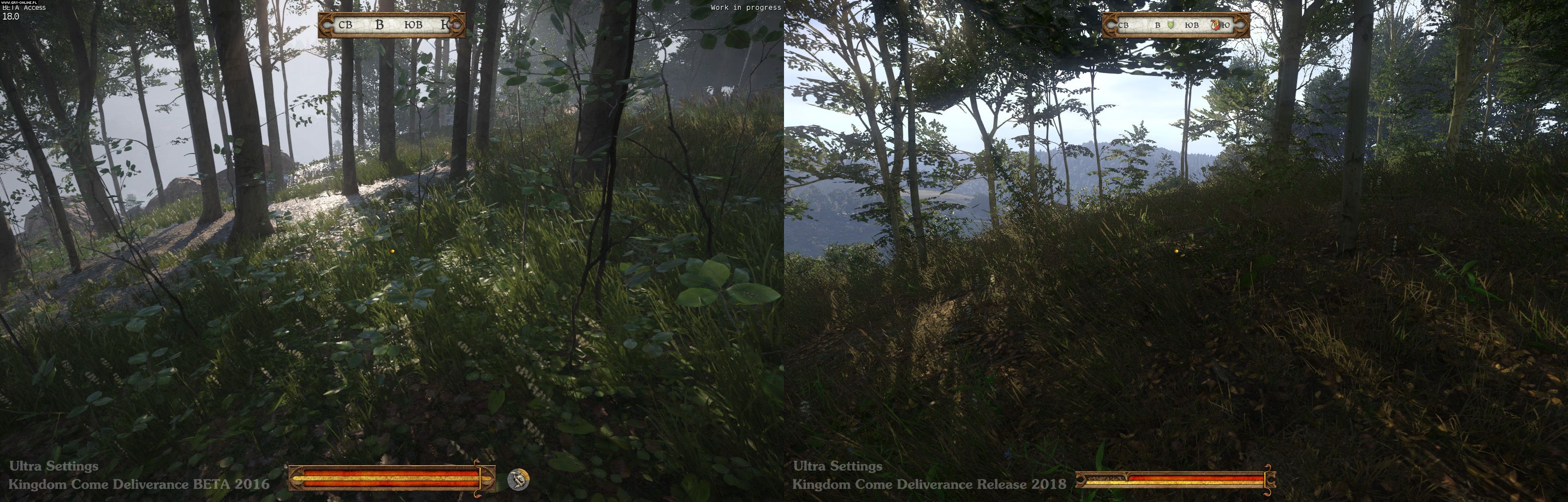 Obie wersje gry działają na ustawieniach ultra, zrzuty ekranu miały być zaś robione przy identycznych warunkach pogodowych i o tej samej porze dnia w grze. Już na pierwszy rzut oka różnica jest dość znacząca i dotyczy przede wszystkim oświetlenia, które prezentuje się o niebo efektowniej i naturalniej w przypadku bety z 2016 roku. Różnice obejmują też inne aspekty oprawy graficznej – jak widać, roślinność porastająca podłoże lasu obecnie w niczym nie przypomina gęstego runa i krzewów, które sprawiały, że ówczesna szata Kingdom Come: Deliverance czyniła produkcję momentami wręcz fotorealistyczną.