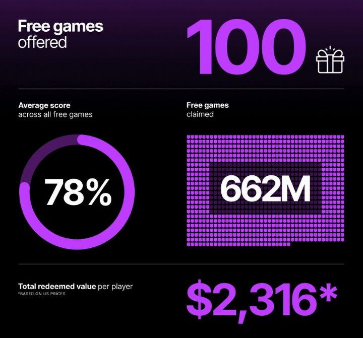 Epic Games w sumie rozdało za darmo 100 gier (firma najwyraźniej liczy tutaj także pakiety przedmiotów do pozycji free-to-play, gdyż w 2025 roku podarowała fanom 92 produkcje sensu stricto), które gracze odebrali ok. 662 milionów razy. Jeśli użytkownik zgarnąłby wszystkie te bezpłatne tytuły, zaoszczędziłby aż 2316 dolarów, czyli prawie 8300 złotych. Warto dodać, że sklep przekroczył barierę 6 tysięcy gier dostępnych w ofercie.
