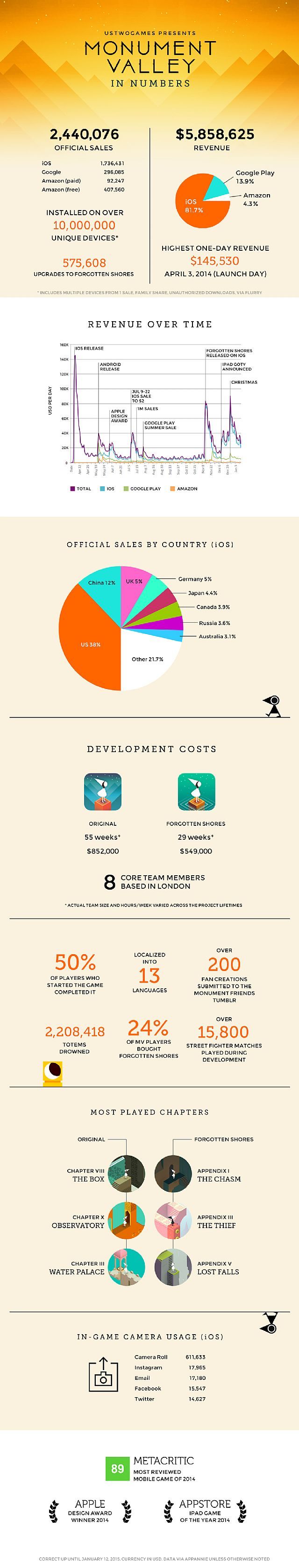 Koniec końców, Monument Valley wraz z wydanym 8 listopada dodatkiem Forgotten Shores przyniósł studiu prawie 5,86 milionów dolarów przychodu, przy czym znów ogromna jego część (ponad 80 procent) pochodzi ze sprzedaży poprzez sklep iOS (Google Play wygenerowało niecałe 14 procent). Nie jest to zaskakujące, skoro już w dniu premiery w App Store, czyli 3 kwietnia produkcja przyniosła ponad 145 tysięcy dolarów zysku, co było zresztą najlepszym wynikiem w ciągu jednego dnia.