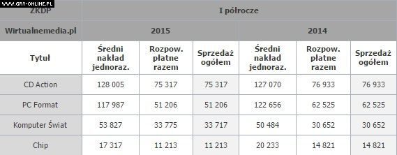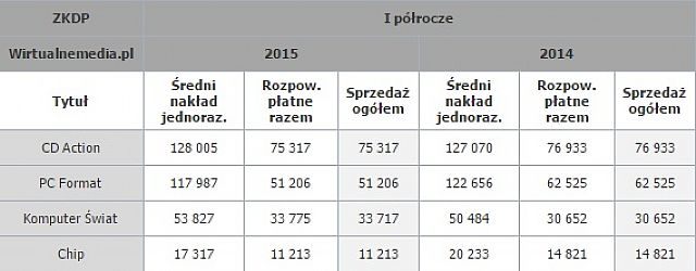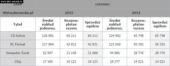 Za CD-Action uplasowały się kolejno: PC Format, Komputer Świat oraz Chip. Najciekawsze zmiany w stosunku do pierwszych dwóch kwartałów 2014 roku zaszły u dołu tabeli. Jedynym magazynem, który zyskał w zestawieniu – i to aż o 10 procent – jest Komputer Świat, wydawany przez Ringier Axel Springer Polska. Z kolei miesięcznikiem, który stracił najbardziej względem pierwszego półrocza zeszłego roku jest Chip - jego sprzedaż zmniejszyła się o niemal jedną czwartą, do poziomu 11 213 egzemplarzy. Znaczący spadek, na poziomie 18,10 procent, zaliczył także drugi w rankingu PC Format – ze średnio ponad 62 tysięcy egzemplarzy do nieco powyżej 51 tysięcy.