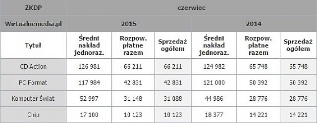 Podobnie jak w badaniu dotyczącym pierwszego półrocza obecnego i zeszłego roku, najmocniej zyskuje Komputer Świat - od 28 776 sprzedanych kopii w czerwcu 2014 r. do 31 088 w czerwcu 2015 r., czyli o 8,03 procenta. Natomiast stratę po raz kolejny odnotował magazyn Chip, wydawany przez Grupę Burda – tutaj spadek wyniósł aż 28,82 procent.