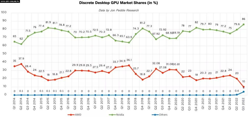 Sprzedaż kart graficznych dla stacjonarnych komputerów spada od wielu lat, głównie dzięki rosnącej popularności układów mobilnych w laptopach. Po trzecim kwartale 2022 roku można powiedzieć, że od 20 lat nie było tak źle. Mobilnie „grafiki”, po dobrym zakończeniu 3 kwartału w 2021 roku, obecnie także notują spory spadek.