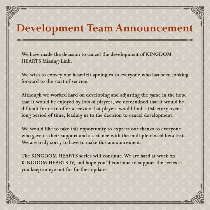Kingdom Hearts nie doczeka się własnej gry-usługi Missing-Link, która po kilku zamkniętych beta-testach trafiła do kosza. Z kolei prace nad Kingdom Hearts 4 trwają.