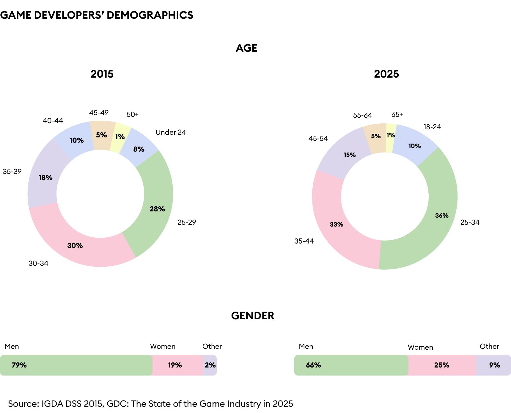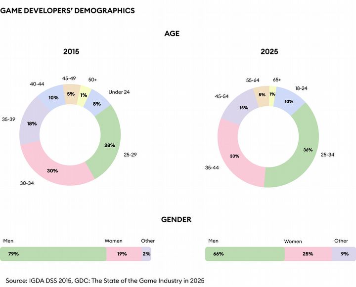 Grupy wiekowe na obu grafikach nie są takie same, bo dane z 2015 r. opracowało Międzynarodowe Stowarzyszenie Twórców Gier, a te z 2025 roku pochodzą z ankiety na GDC 2025.