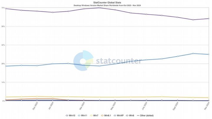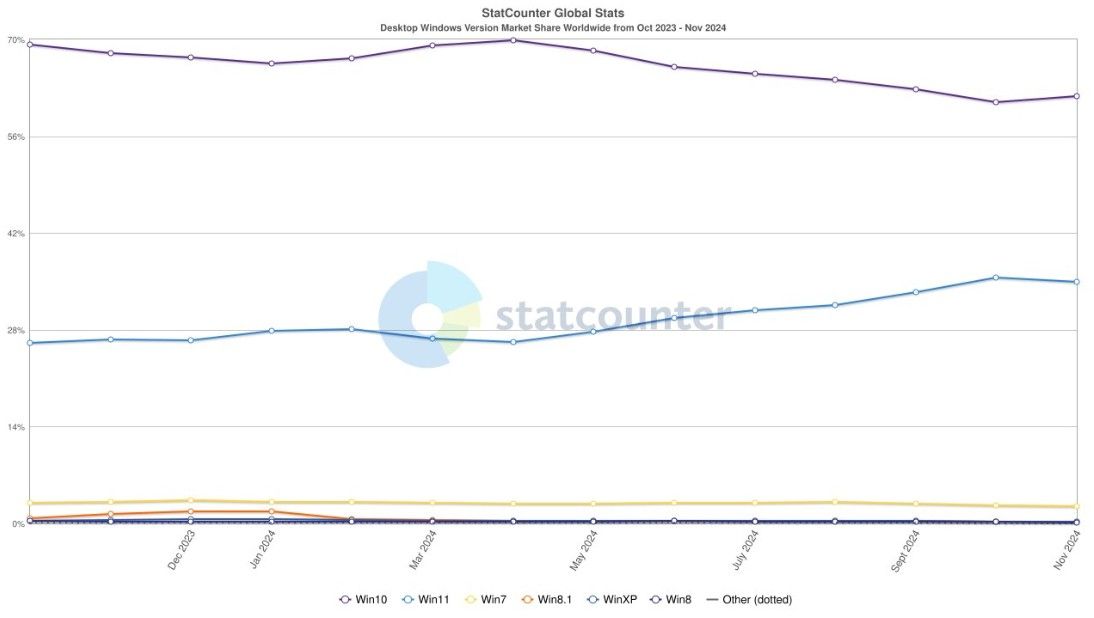 Według statystyk Statcounter Windows 10 w listopadzie osiągnął 62% udziału wśród wszystkich komputerów, nieco odrabiając w stosunku do października. Wzrost przewagi może być jednak chwilowy, wywołany wydarzeniem lub procesami rynkowymi. Windows 11 zwiększa swoje zasięgi z miesiąca na miesiąc, przyciągając nowych użytkowników. Trzeba uczciwie przyznać, że robi to bardzo powoli, zapewne w ten sposób spędzając sen z powiek Microsoftowi.