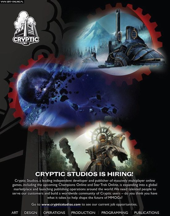 Tak więc nie mylili się ci, którzy właśnie Star Trek Online upatrywali w nowym, nieujawnionym jeszcze projekcie Cryptic Studios, a którego dotyczył zegar widniejący na witrynie spółki. Zgodnie z wcześniejszymi obietnicami, czasomierz zniknie lada godzina, ale już teraz w najnowszym numerze Game Developer Magazine można przeczytać ogłoszenie, w którym Cryptic Studios poszukuje osób pragnących podjąć pracę przy tworzeniu gier Champions Online oraz Star Trek Online.
