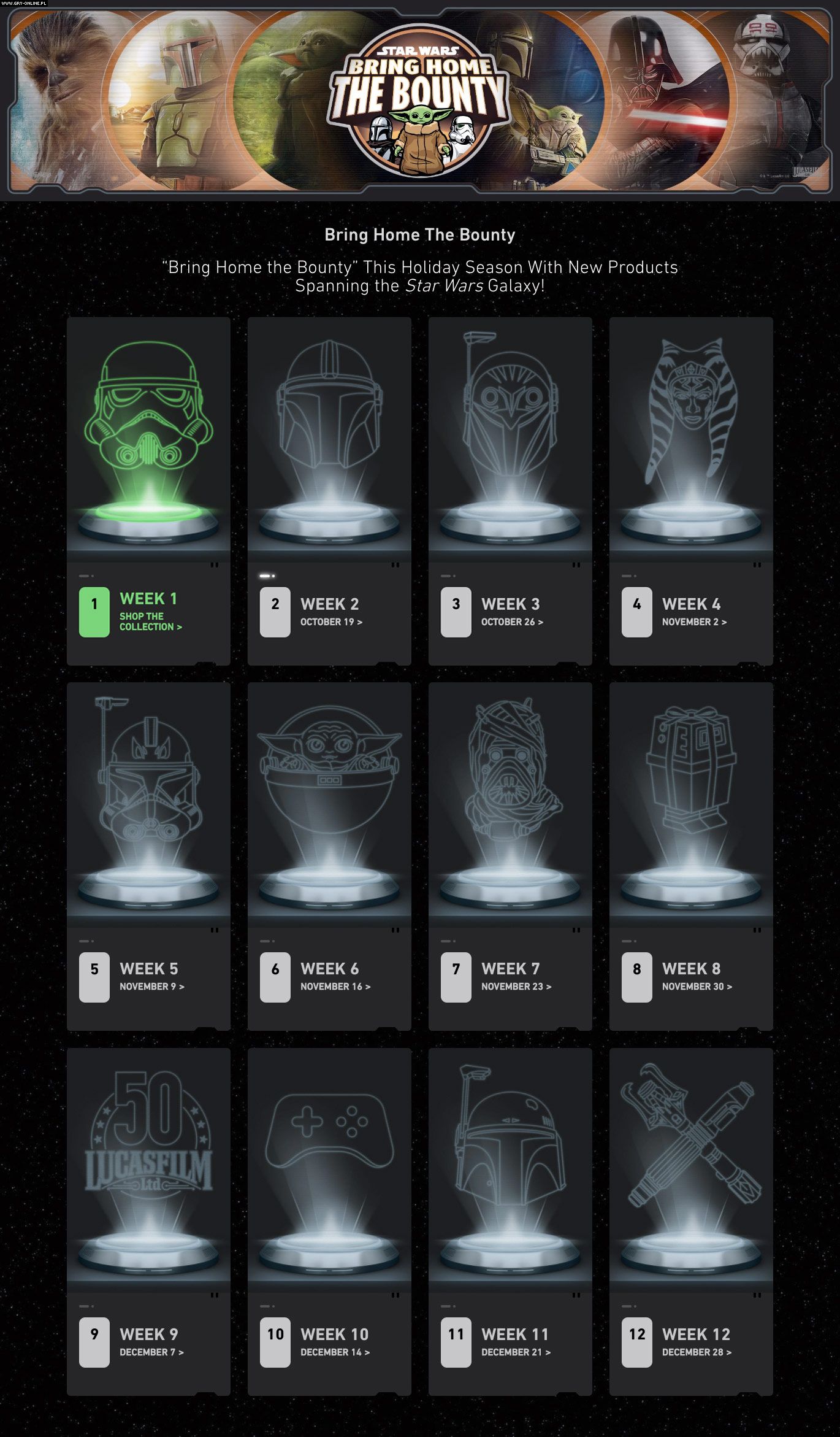 Firmy Disney i Lucasfilm rozpoczęły kampanię Bring Home the Bounty, która ma nam przynieść wiele nowości odnośnie Gwiezdnych wojen. Co tydzień będą pojawiać się kolejne zapowiedzi związane z tym uniwersum. Jak wynika z grafiki opublikowanej z okazji akcji, jedną z ogłoszonych rzeczy może być nowa gra.