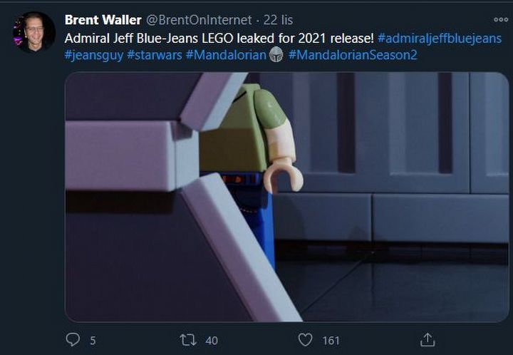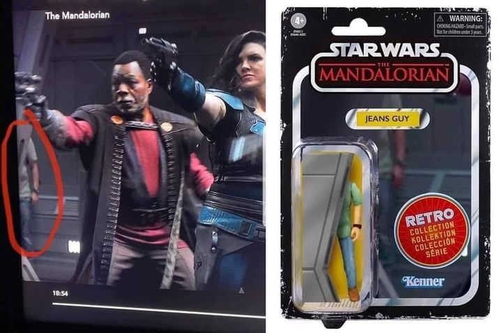 Stało się to w 12. odcinku serialu podczas jednej ze strzelanin. Do Dina Djarina, Greefa Kargi i Cary Dune dołączył tajemniczy sojusznik, który skrył się gdzieś za ścianą. Był to najprawdopodobniej zwykły członek ekipy filmowej, który znalazł się przypadkiem w kadrze – fani mają jednak swoją wersję zdarzeń. Twierdzą, że to Admirał Jeff Blue Jeans, imperialny oficer, a przede wszystkim dzielny wojownik, którego znakami rozpoznawczymi są dziwnie współczesne spodnie oraz t-shirt.