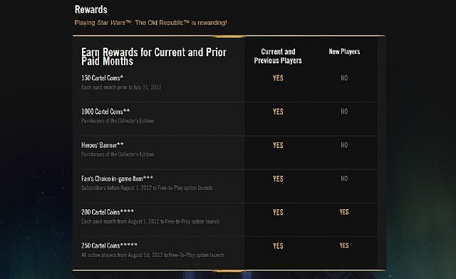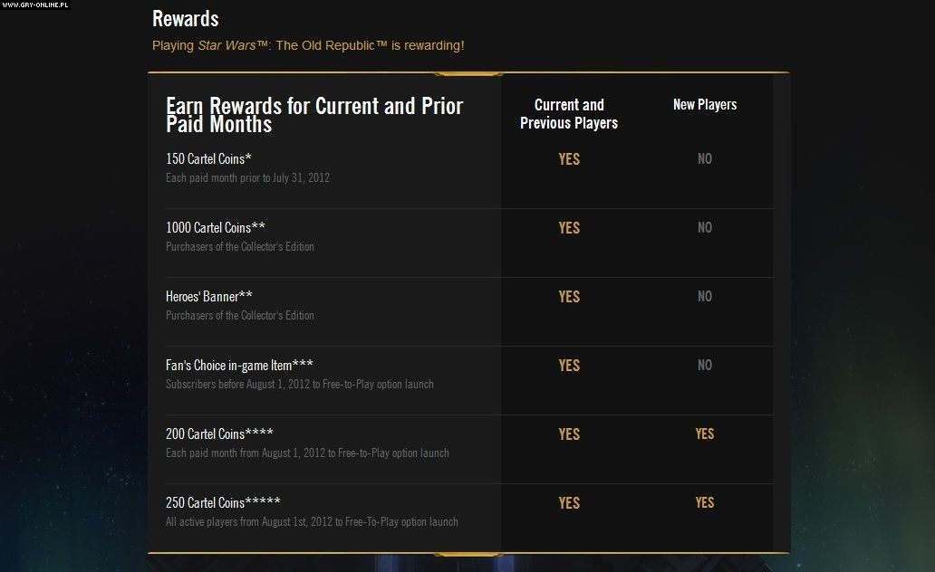 Nadal będzie też możliwe płacenie abonamentu za rozgrywkę. W przypadku zdecydowania się na takie rozwiązanie, gracze uzyskają co miesiąc określoną liczbę Monet Kartelu [Cartel Coins], które pozwolą na zakupywanie lepszych przedmiotów oraz odblokowywanie dodatkowych funkcji. Nowa waluta zostanie wprowadzona do świata The Old Republic w momencie przejścia na format free-to-play lub krótko po nim. Co ciekawe, dotychczasowi abonenci mogą liczyć na specjalną premię nowej waluty oraz uzyskanie wyjątkowych przedmiotów (np. za każdy miesiąc subskrypcji lub zakupienie Edycji Kolekcjonerskiej). Szczegółowe informacje na ten temat można znaleźć na oficjalnej stronie gry.
