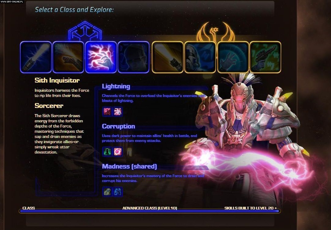 Przypomnijmy, że klasy zaawansowane będą dostępne po osiągnięciu przez prowadzoną przez gracza postać konkretnego poziomu doświadczenia (obecnie jest to poziom 10 jak możemy wyczytać ze screenów). Do wyboru otrzymamy 2 klasy zaawansowane, a nasza decyzja, według twórców gry, ma być tak samo istotna jak w przypadku wyboru podstawowej klasy postaci na początku rozgrywki. Wybór takiej klasy uczyni naszą postać nie tylko potężniejszą ale także pozwoli na lepsze zdefiniowanie roli jaką odegramy w Star Wars: The Old Republic podczas dalszej rozgrywki.