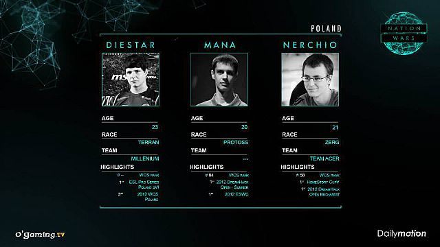 W skład polskiej drużyny weszli najbardziej rozpoznawalni gracze z naszego kraju – Nerchio grający Zergami, MaNa dowodzący Protossami i Diestar kierujący Terranami. W turnieju NationWars bierze udział osiem państw, stworzono więc dwie grupy z czterema reprezentacjami w każdej z nich. W pierwszym meczu Polacy zmierzą się silną ekipą z Norwegii. Zwycięzca tego starcia spotka się następnie z Hiszpanią lub Rosją, w zależności od wyniku pojedynku między tymi reprezentacjami. Mecze będą odbywały się w formacie „all kill”, a więcej informacji można znaleźć w serwisie teamliquid.net: