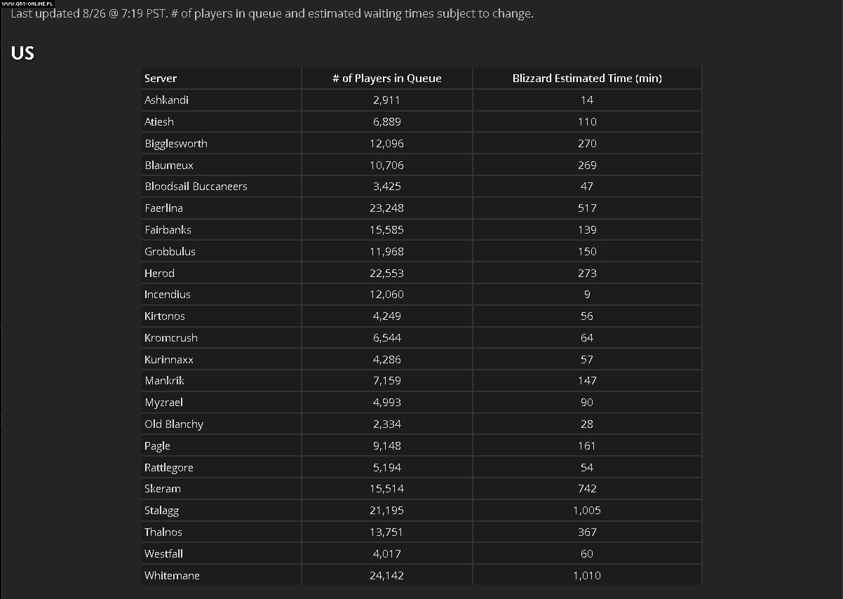 Pesymistyczne prognozy Blizzarda niestety się spełniły i gracze byli zmuszeni czekać w gigantycznych kolejkach. W przypadku najpopularniejszych światów trzeba było zarezerwować sobie dodatkowe 3 godziny, aby w ogóle dostać się do gry. Jednak nawet to nie zniechęciło użytkowników. Chętnych nie brakowało i wciąż nie brakuje, bowiem raport sprzed 3 godzin pokazuje, jak wielkie oblężenie przeżywają amerykańskie serwery.