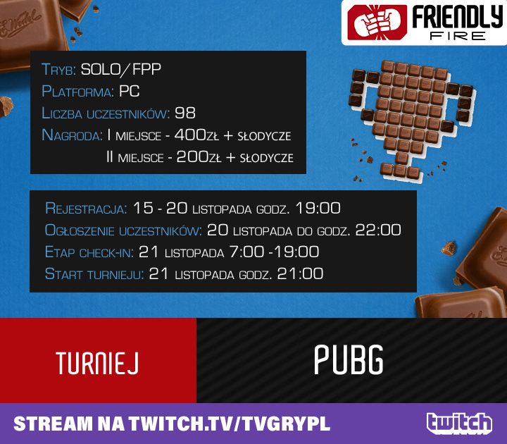 W przyszłym tygodniu rozegramy kolejny turniej w ramach Friendly Fire by Wedel Up!, w którym gracze po raz kolejny zmierzą się w grze PUBG. Tym razem jednak zawodnicy będą zmagać się w pojedynkę. Za zajęcie pierwszego oraz drugiego miejsca przewidziane są nagrody pieniężne oraz zestawy słodkości od marki E. Wedel, a także kolejne punkty w rankingu generalnym obecnego sezonu.