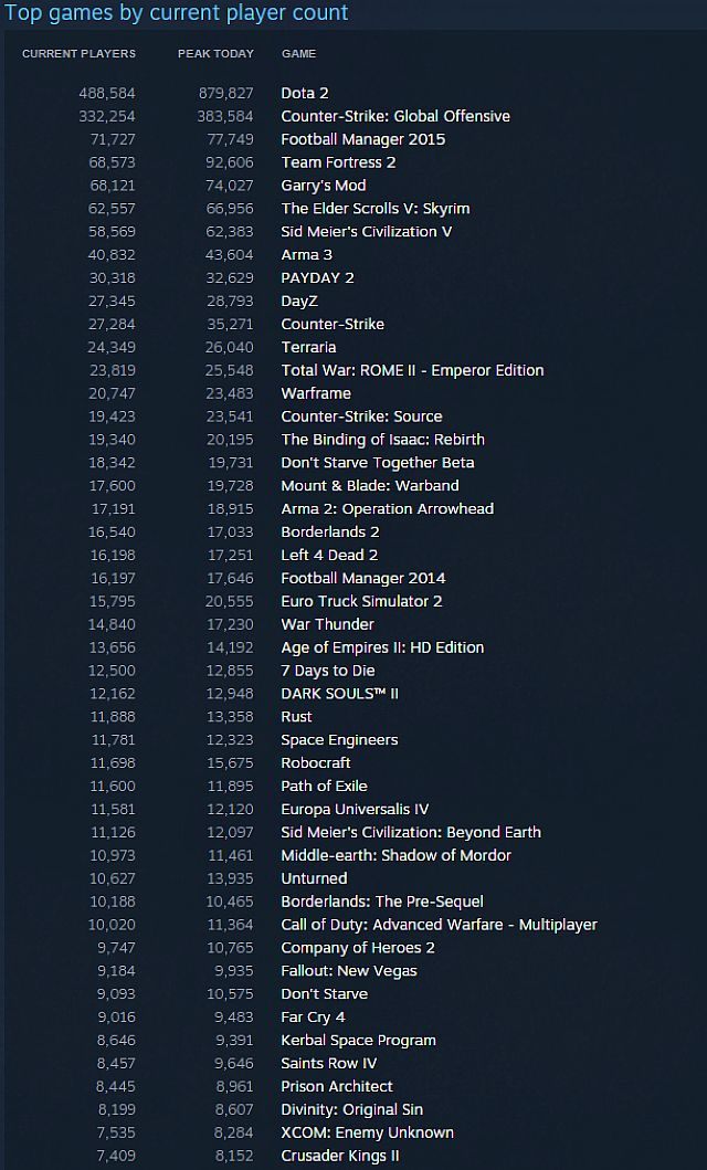Powyżej znajdziecie także statystyki dotyczące produkcji, w które najchętniej grali użytkownicy Steama. Tak jak pod koniec zeszłego roku, absolutnie bezkonkurencyjne są Dota 2 oraz Counter-Strike: Global Offensive – liczbę osób równocześnie bawiących się przy tych tytułach liczyć można już w setkach tysięcy. Wyjątkowo popularny pozostaje Garry's Mod, który pierwszy raz został zaprezentowany graczom już w 2006 roku. Pierwszą piątkę uzupełnia niedawno wydany Football Manager 2015 oraz darmowe Team Fortress 2.